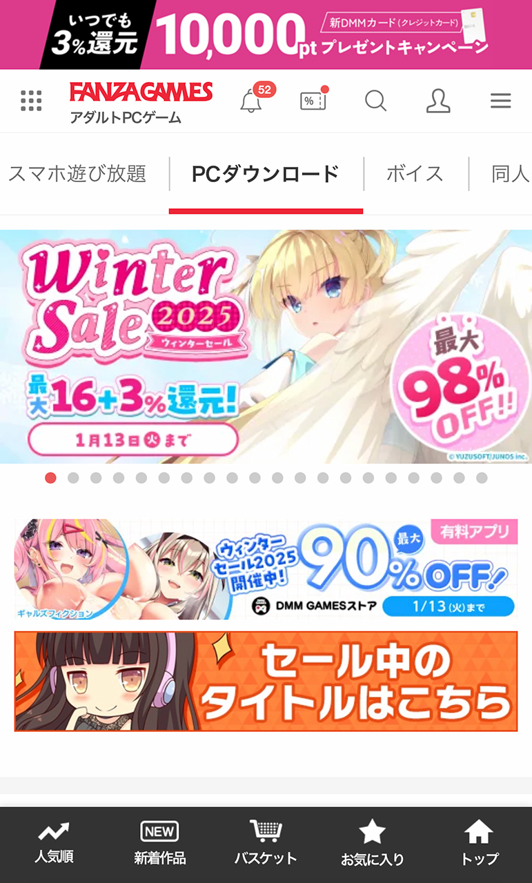 ▲まずはFANZAの「PCゲーム」トップ画面を開こう。そして、右上の虫眼鏡アイコンから作品を検索だ。トップ画面から検索しても問題ないぞ