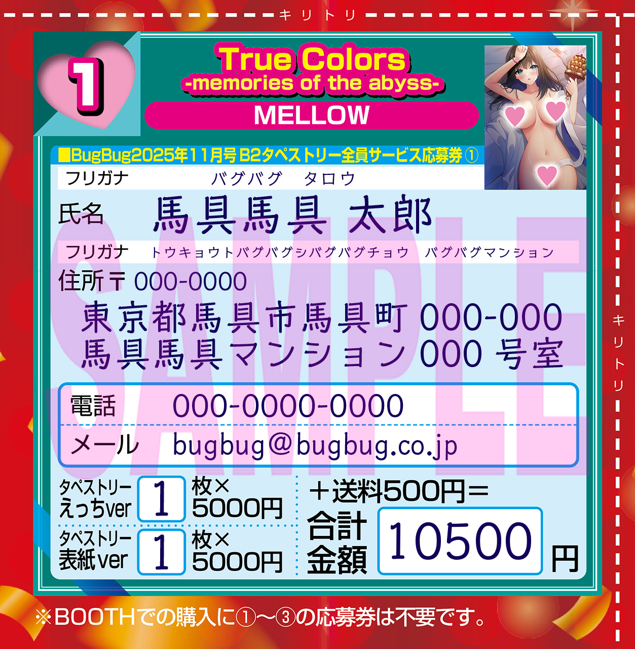 現金書留で申し込む場合は、誌面に付いた応募券が必要になる。BugBug11月号の74ページ「B2タペストリー応募者全員サービスのお知らせ」に応募券が付いているので、切り取るかコピーして使用しよう。電子書籍(10/10配信予定)の場合は、プリントしたもので応募可能だ。