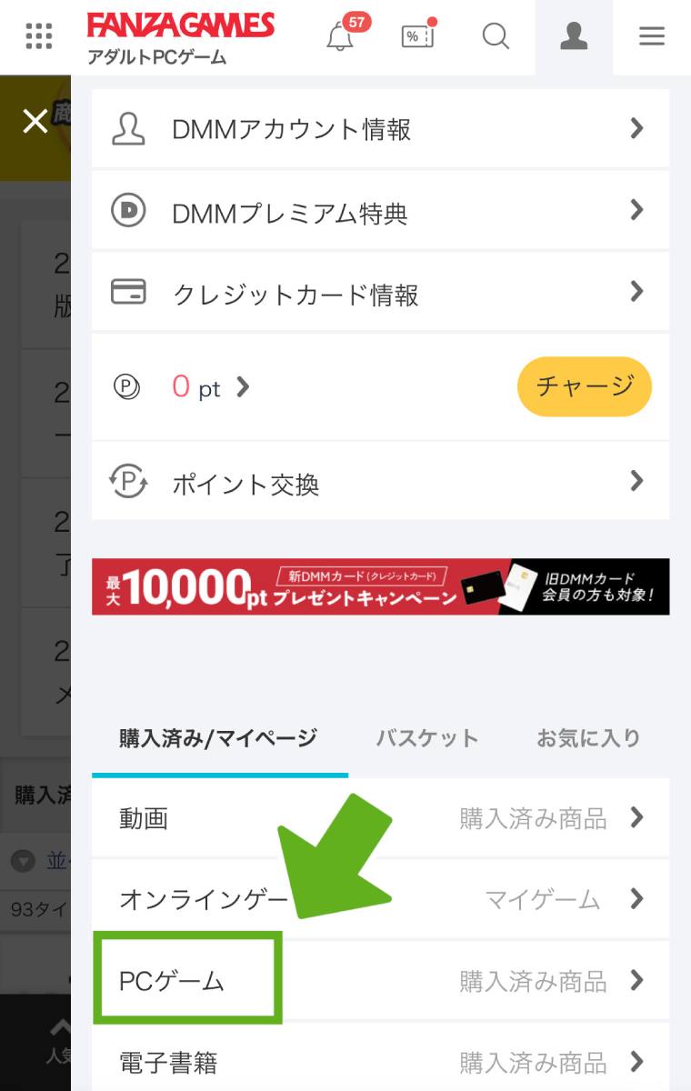 ▲購入完了したら、検索に使った虫眼鏡アイコン右の人の頭みたいなアイコンから、「購入済み/マイページ」の「PCゲーム」をクリック