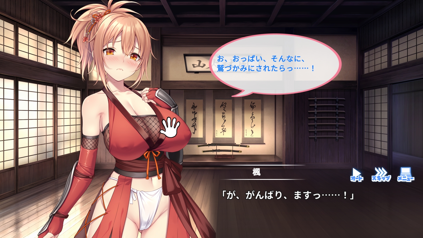 とはいえ久利須が「こんな修行、簡単だろ」とか、「これも修行だからな」と挑発すると、「こ、こんなの楽勝ですっ……!」と乗って来ちゃうのが楓の楓たるゆえん。その対抗心はあっぱれなんですが、おっぱいを鷲づかみにされただけで、「やっぱり、無理ぃ……♥ 兄さまに、されてるって思っちゃうだけでっ、わたしっ……!」と、一瞬で軍門に降っちゃう“エロさへの従順さ”は本シリーズならではです。