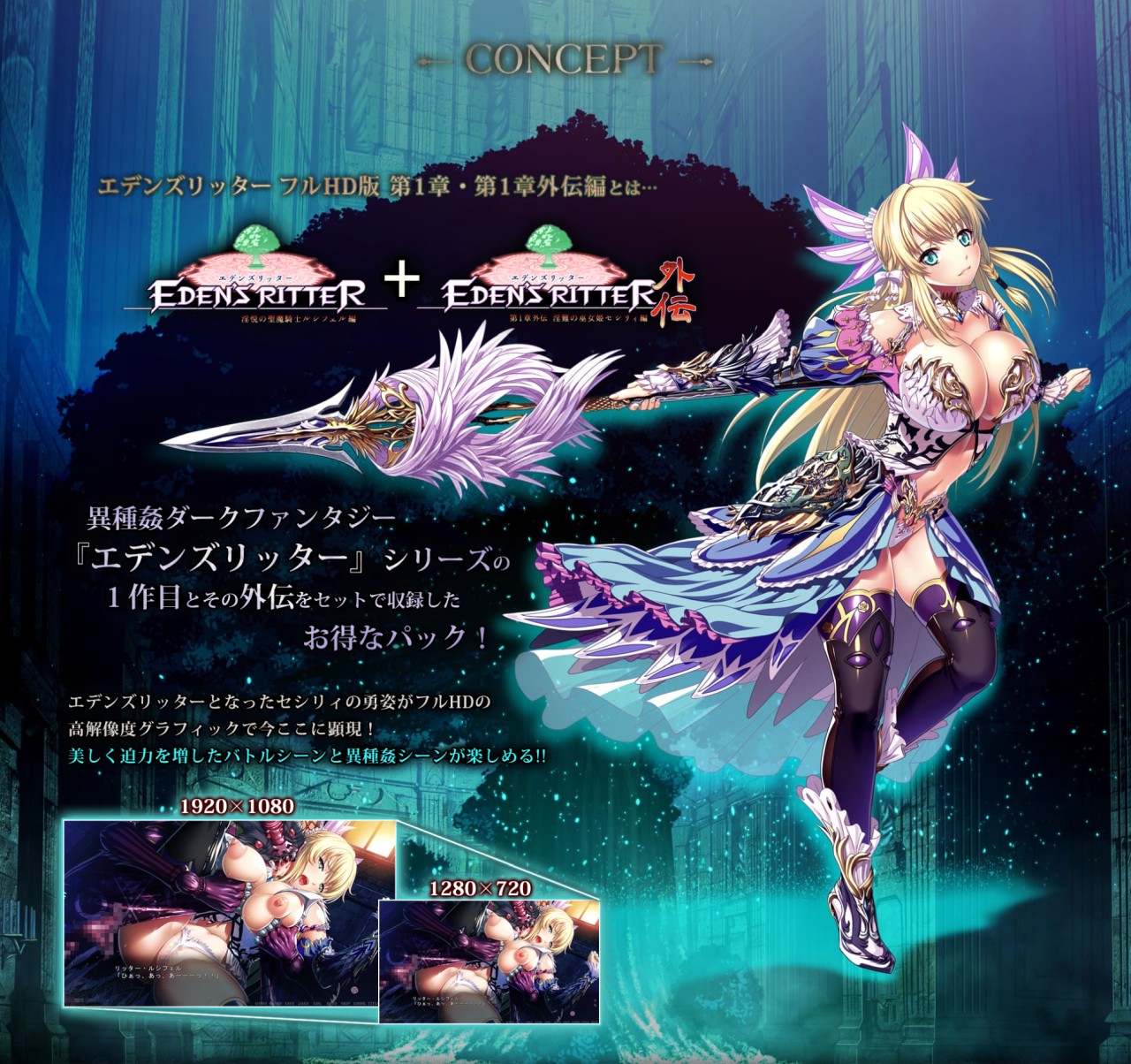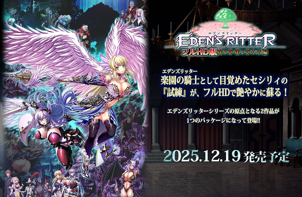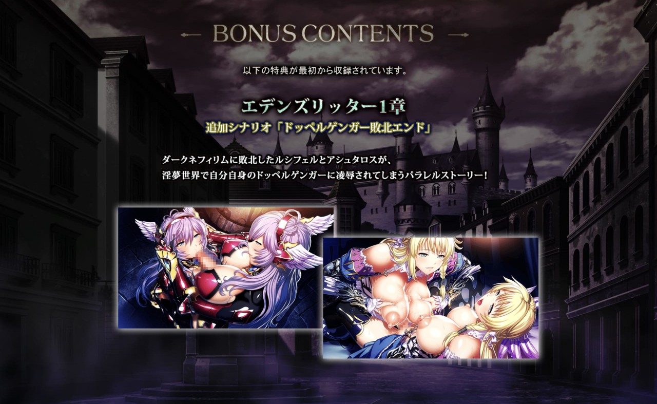 そんな記念すべき第一作『エデンズリッター 淫悦の聖魔騎士ルシフェル編』(第一章)、そしてその外伝『エデンズリッター第1章外伝 淫難の巫女姫セシリィ編』が、セットになったお得なパッケージで登場!! 単にセットになっただけではなく、解像度が1280×720からフルHDの1920×1080に高精細化された、リマスター版と呼ぶに相応しいクオリティでの再登場なのだ。さらに外伝だけでなく、物語のifを描いた追加のパラレルシナリオ『ドッペルゲンガー敗北エンド』も最初から収録しているぞ。