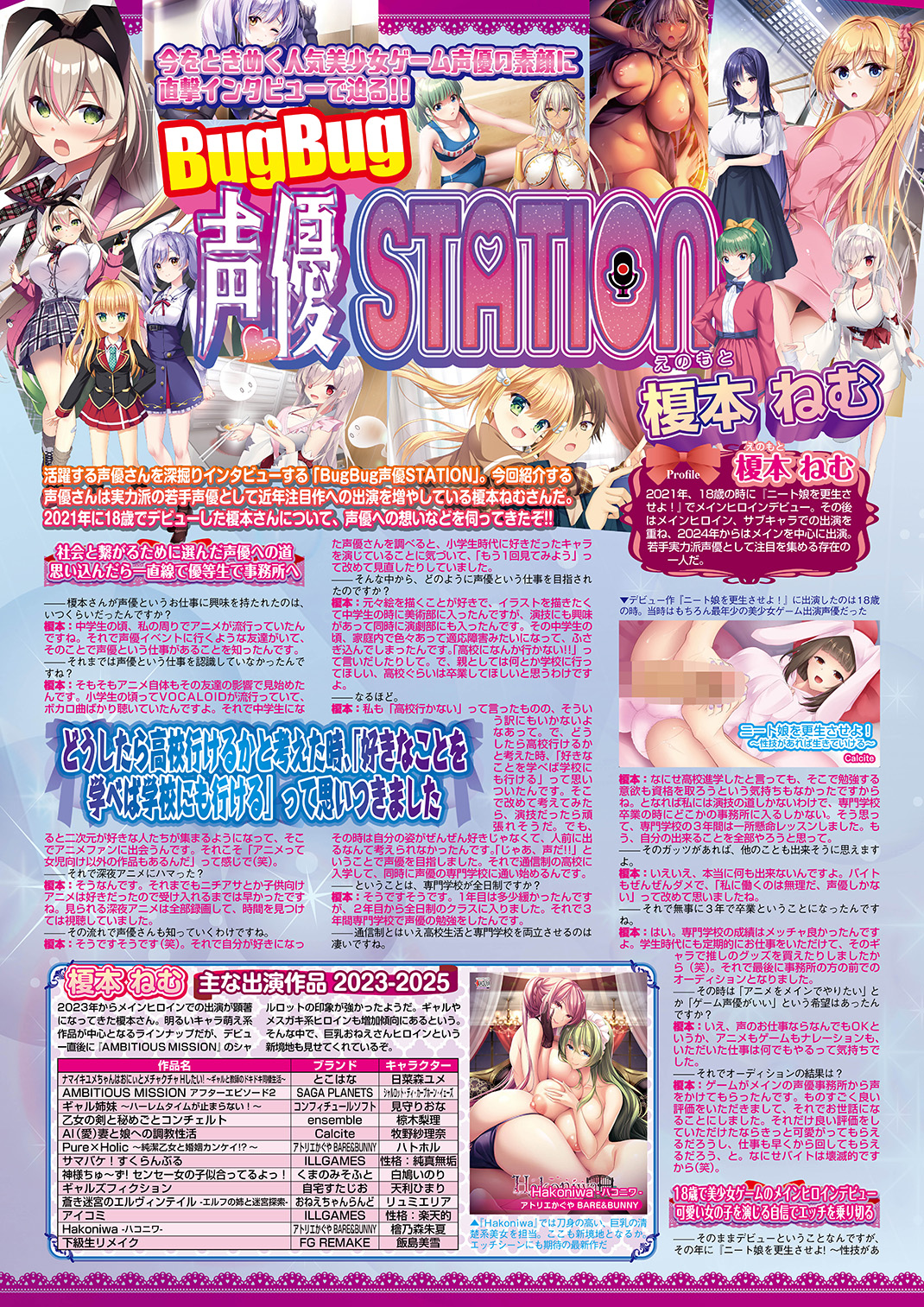 今をときめく人気声優の素顔にロングインタビューで迫り、大好評の「BugBug声優STATION」。今回お話を伺ったのは、注目作に次々と出演して絶賛ブレイク中な若手実力派声優・榎本ねむさん。今号で表紙&巻頭大特集した『下級生リメイク』でヒロインの一人である飯島美雪を演じるのも話題なのだ。そんな榎本ねむさんに、2021年に18歳でデビューするまでの経緯や、WEBラジオでのエピソードや忘れられない収録の思い出やオフでの過ごし方等々、気になるアレコレをカラー4ページに渡ってたっぷり直撃!! 大好評の直筆サイン色紙プレゼントも要チェック♪