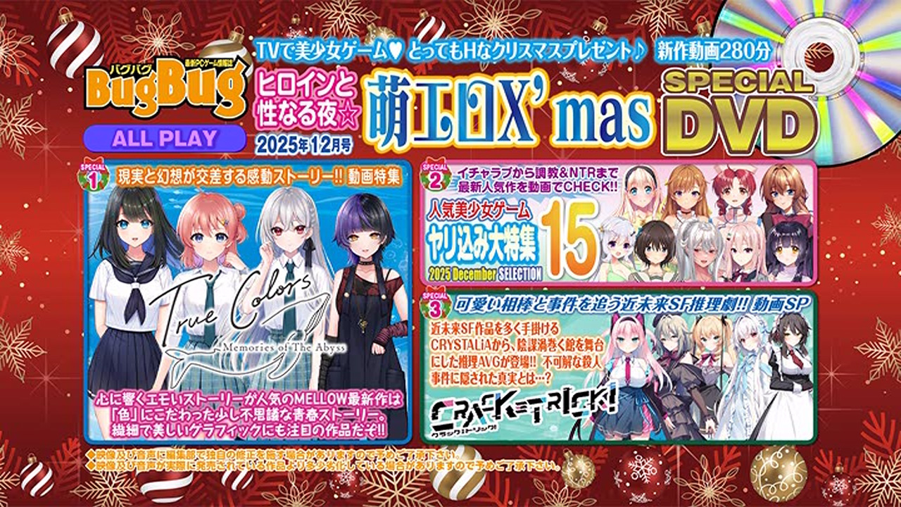 最新美少女ゲームの見所をTVで一気にまとめて楽しめ、大好評のBugBug付録DVD。まず今月は心に響くエモいストーリーが人気なMELLOWの『True Colors -memories of the abyss-』を大特集!! ちょっと不思議でミステリアスな青春ストーリーに加え、繊細で美しいグラフィックにも注目だ。もう一つの特集は、かずきふみ×CRYSTALiAの強力タッグが話題を集める『CRACK≡TRICK!』。近未来サイバーミステリーAVGの魅力を動画でたっぷり紹介するぞ。そして恒例の「人気美少女ゲームヤリ込み大特集15」では、『アマカノ3』(あざらしそふと)、『聖奴隷学園3』(Liquid)、『ライムライト・レモネードジャム』(ゆずソフト)、『野々村病院の人々 リメイク』(FG Remake)等、9・26の超大作を中心に15本をHシーンも満載で大収録♪