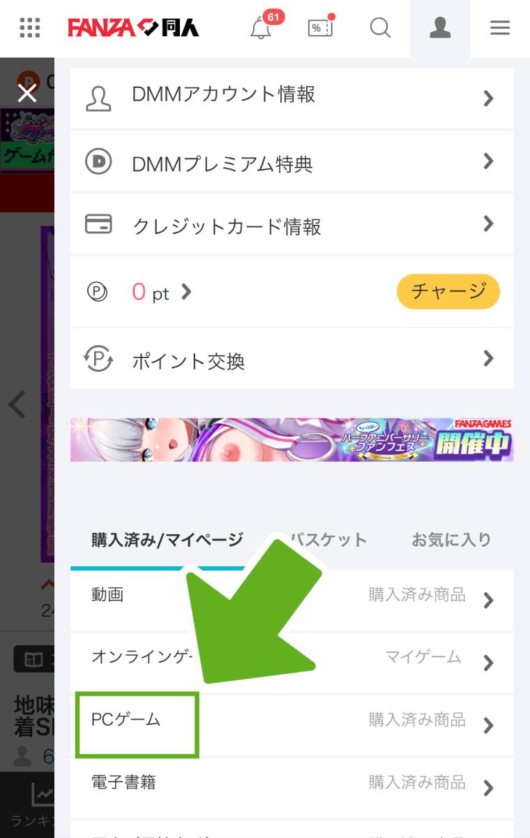 ▲虫眼鏡アイコン右にある人型のようなアイコンより「購入済み/マイページ」の3段目にある「PCゲーム」を選択