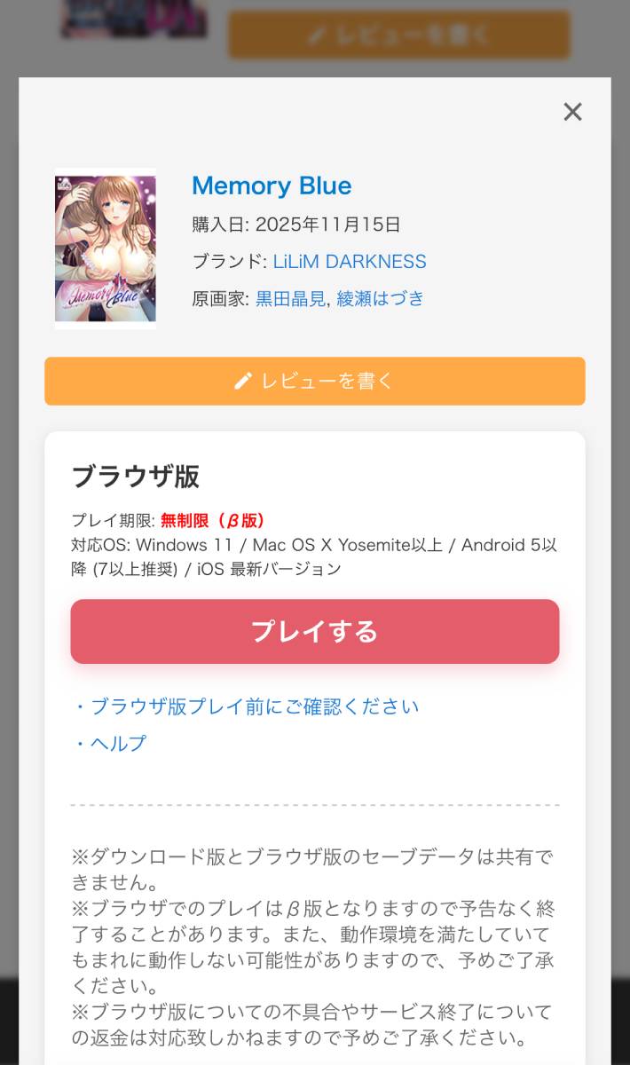 ▲購入済み作品一覧から「作品をみる」→「プレイする」を選択しよう。そうすると、すぐにブラウザ版が起動して遊べるようになるぞ!!