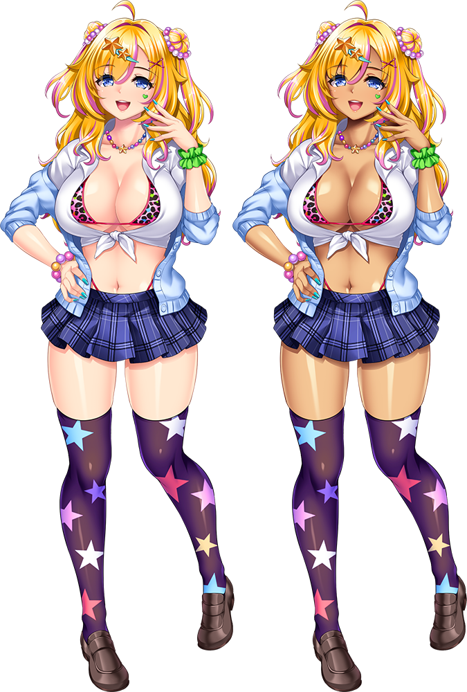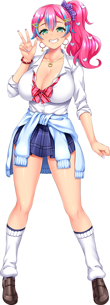 いかにも遊んでいそうな見た目の派手ギャルで、肉感的スタイルを武器にSEXしまくるのが大好き。特に童貞を筆下ろしすることを好んでいる。陽気でノリが良く少々オバカなところはあるが、裏表がなく誰とでも仲良くなれる性格。Hのテクだけでなく、メイクや身だしなみといった魅力的になれるアドバイスをしてくれることも。
