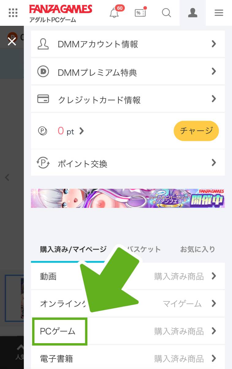 ▲虫眼鏡アイコンの右にある人型アイコンから、「購入済み/マイページ」の「PCゲーム」をクリック