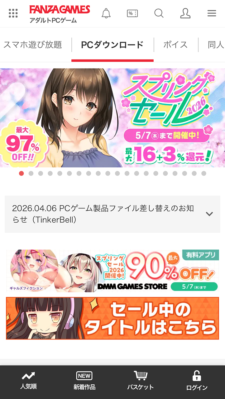 ▲まずはFANZAの「PCゲーム」トップ画面を開こう。そして、右上の虫眼鏡アイコンから作品を検索だ