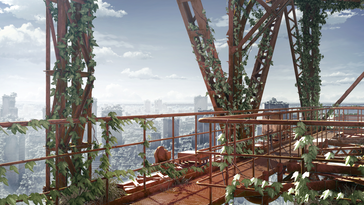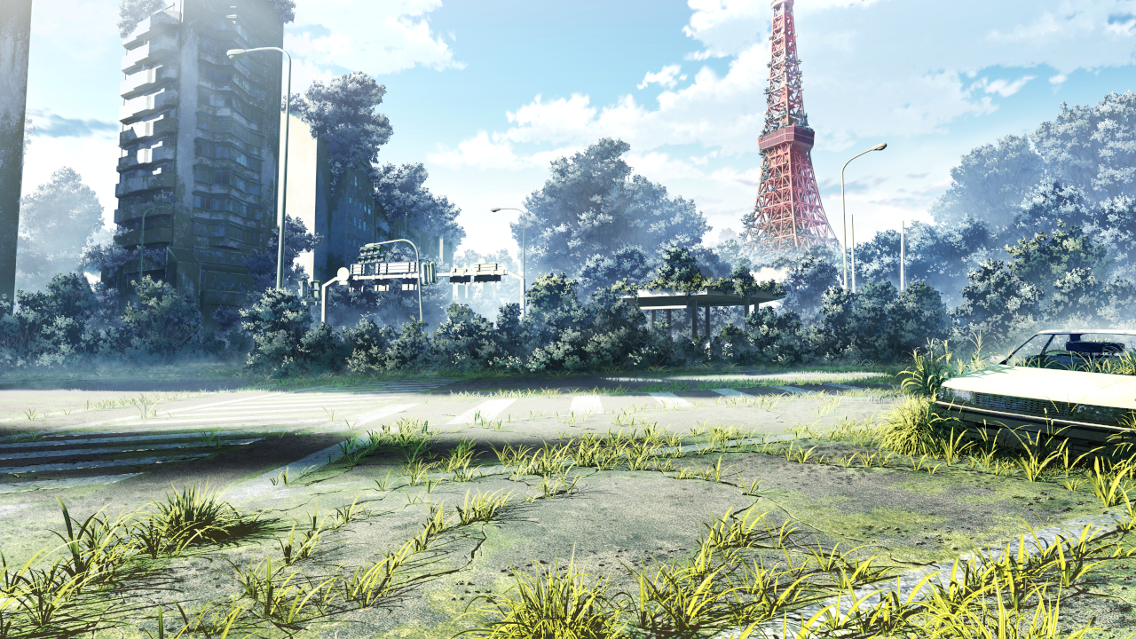 ▲植物が繁茂する東京タワーとその周辺。主人公は東京タワーに住んでおり、ビジュアルと設定だけでもうわくわくする