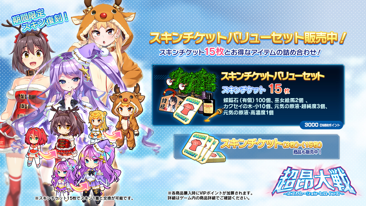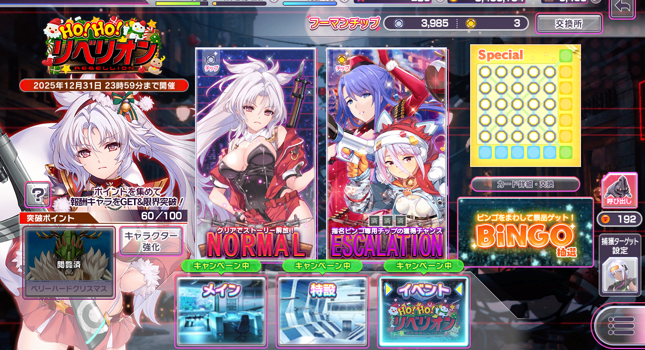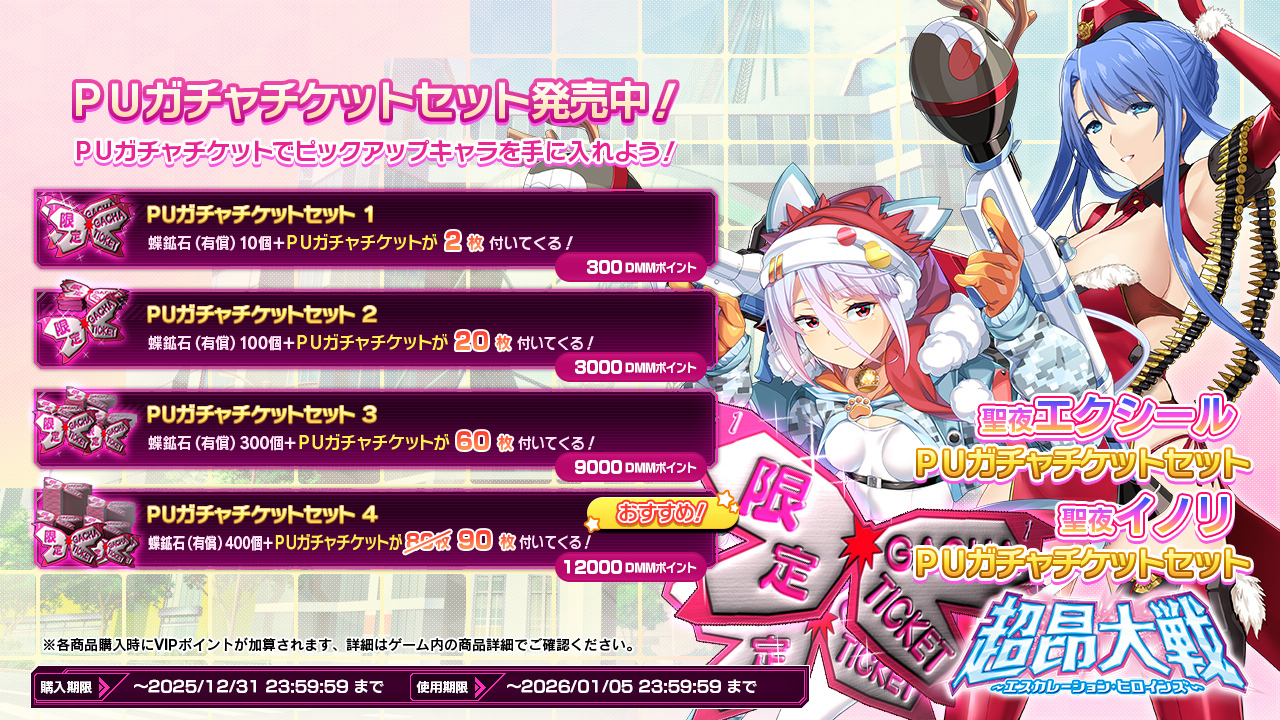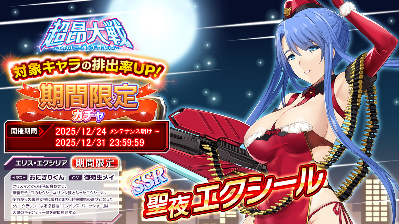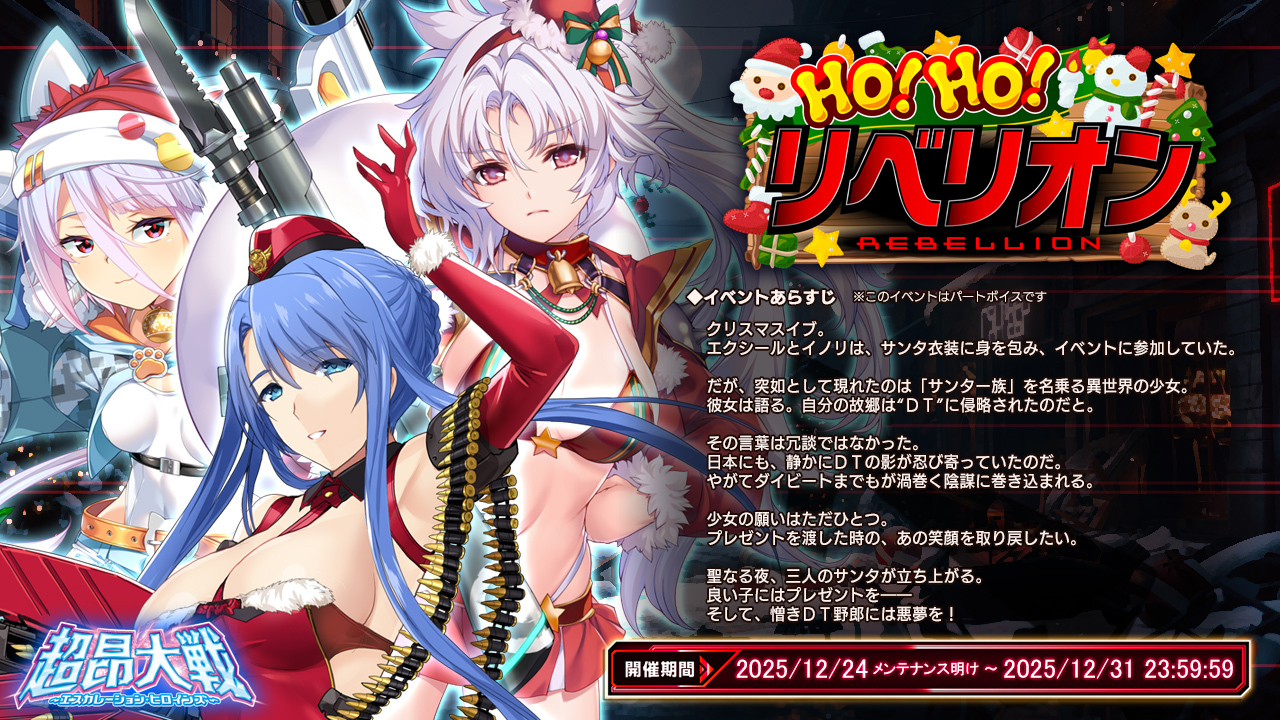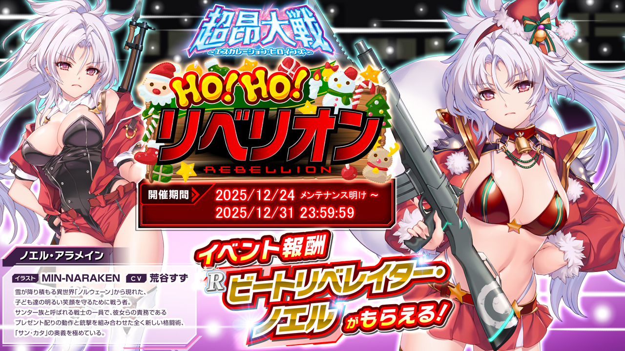 『超昂大戦 エスカレーションヒロインズ』は現在クリスマスイベント2025『HO! HO! リベリオン』が開催中!! このイベントは一週間開催で、終了は12月31日23時59分…つまりイベント終了と同時にノンストップで正月イベント開催!! というわけだ。そういうわけで年末年始キャンペーンとして年末から来年頭にまたがる様々なお得なキャンペーンもあわせて開催中だ。今回はそういった情報をお伝えしよう。