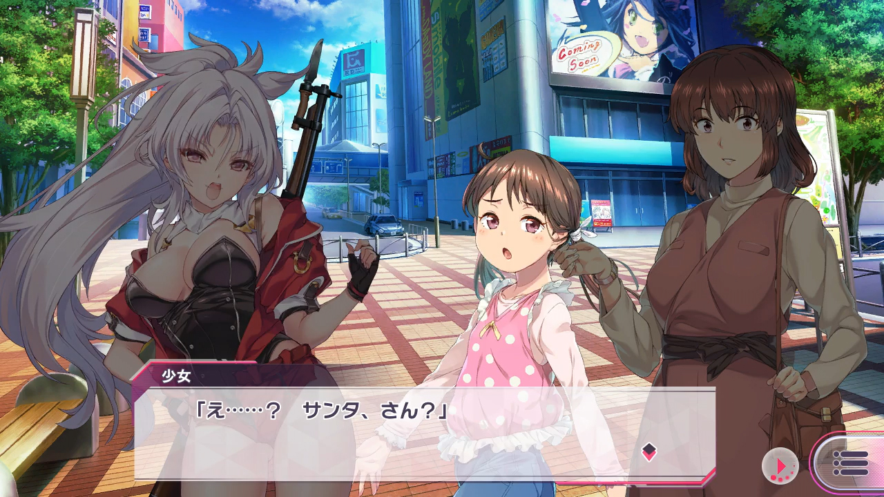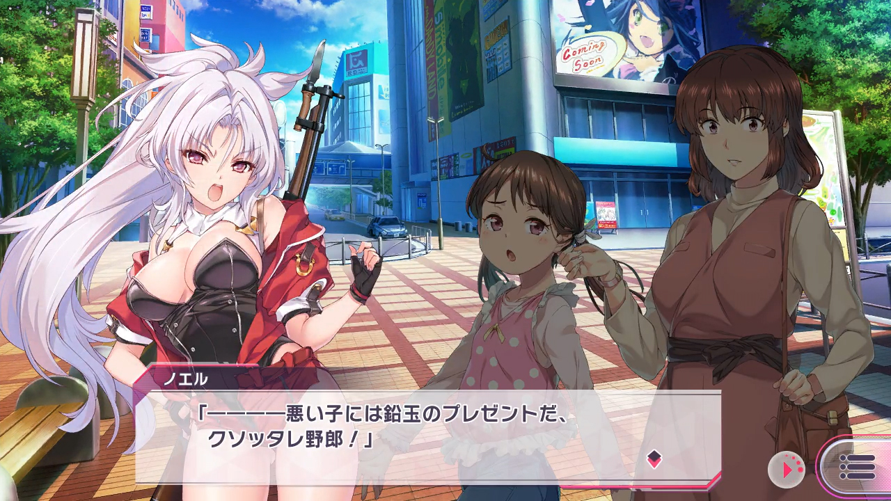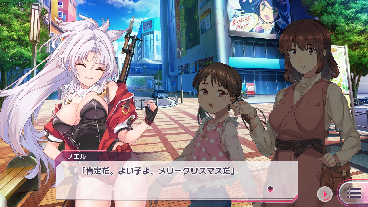 …という異世界「ノルウェーン」から、子供たちの笑顔を奪う怨敵DTキングを追ってこちらの世界にやってきたサンター族の戦士ノエル。“サンタいちぞく”じゃなく“サンターぞく”ね。そんな彼女をサポートするのはこれまであまり接点のなかった、真面目な性格のエリスと奔放で野性的なイノリという2人。微妙に足並みが揃わなくても願いは同じ。さぁ、悪い子たちに鉛弾を山ほどプレゼントするパーリィを始めよう!!