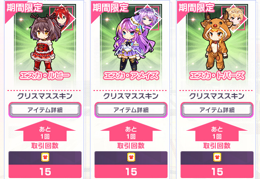 ▲エスカ・ルビー、エスカ・アメイズ、エスカ・トパーズのクリスマススキンも期間限定で登場。先にスキンチケットを購入、それを使って交換して入手する
