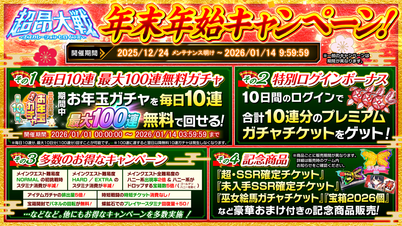 冒頭でお伝えした通り、現在は『年末年始キャンペーン』として、クリスマスイベント2025から正月イベント2026までの期間をセットにしたキャンペーンが行われている。このうち「お年玉ガチャ」は1月1日0時からなので注意しよう。まぁお年玉と言っているくらいだから当然なんだけどね。