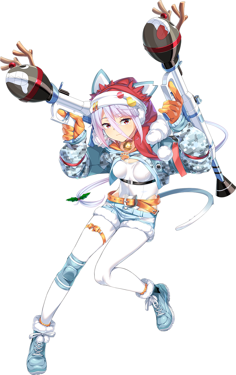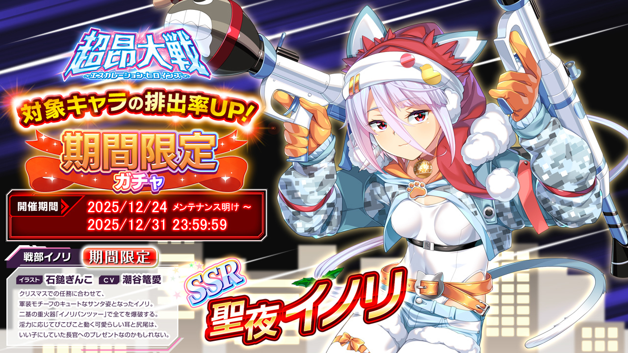 今回のイベントに合わせて新たに実装されたSSRキャラクターは『聖夜エクシール』と『聖夜イノリ』の二人。今回のイベント内容にあわせてエクシールはベルトリンクマシンガン、イノリはパンツァーファウストを装備。『聖夜』シリーズでありながらサンタっぽさはあまりない? いや、こういう解釈もアリだな…これまでの超昂大戦キャラクターとは異なる方向のアレンジが可愛いサンタコスとなっている。
