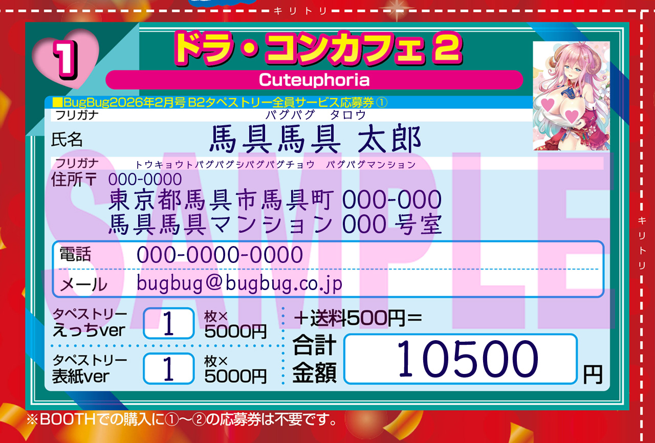 現金書留で申し込む場合は、誌面に付いた応募券が必要になる。BugBug2月号の74ページ「B2タペストリー応募者全員サービスのお知らせ」に応募券が付いているので、切り取るかコピーして使用しよう。電子書籍(1/10配信予定)の場合は、プリントしたもので応募可能だ。