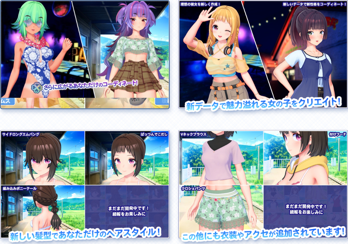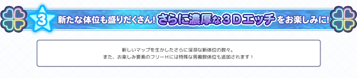 新しい髪型や衣装、アクセサリーなどのクリエイトデータも大量追加。もちろん新しいマップを活かした新エッチの数々も用意されている。ナイトプールでのエッチや、新しい体位、さらにフリーHで使用可能な男複数プレイに対応するとのことで、その手のHシチュが好きな人は期待大だ。