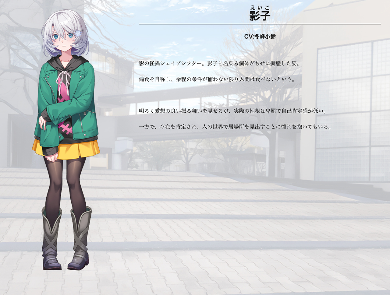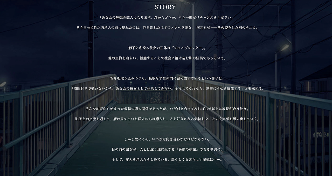 本作のヒロインである影子はシェイプシフターと呼ばれる異形の存在であり、主人公と別れたばかりの元カノ・河元ちせを取り込んでその姿になり替わっている。そんな影子が期限付きで主人公の恋人として生活したいと要求してきた。もし要求を飲んでくれれば、体内にいるちせを解放してくれるらしい。