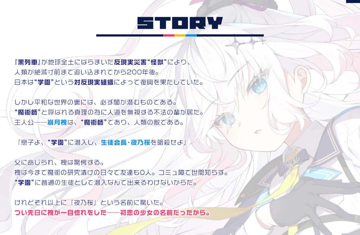 反現実災害・怪獣によって絶滅寸前に追い込まれてから200年後、日本は対反現実組織・学園により復興していた。しかしそんな場所に入学という形で入り込んだ、人類の敵である“魔術師”の主人公・崩月槐(ほうずき えんじゅ)。彼に与えられた任務は生徒会長・夜乃桜(よるの さくら)の暗殺──しかし生徒会長はつい先日、一目ぼれをした初恋の相手だった!?