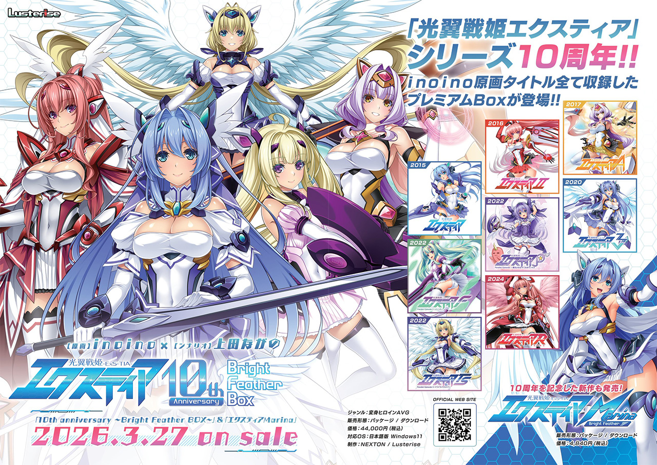 ▲今月の見開き広告は、Lusteriseより3月2日発売予定の7『光翼戦姫エクスティア 10th anniversary Bright Feather BOX』。シリーズ10周年を記念した豪華記念BOXだ。新作の『光翼戦姫エクスティアMarina ~Bright Feather~』単体も同時発売になっているぞ