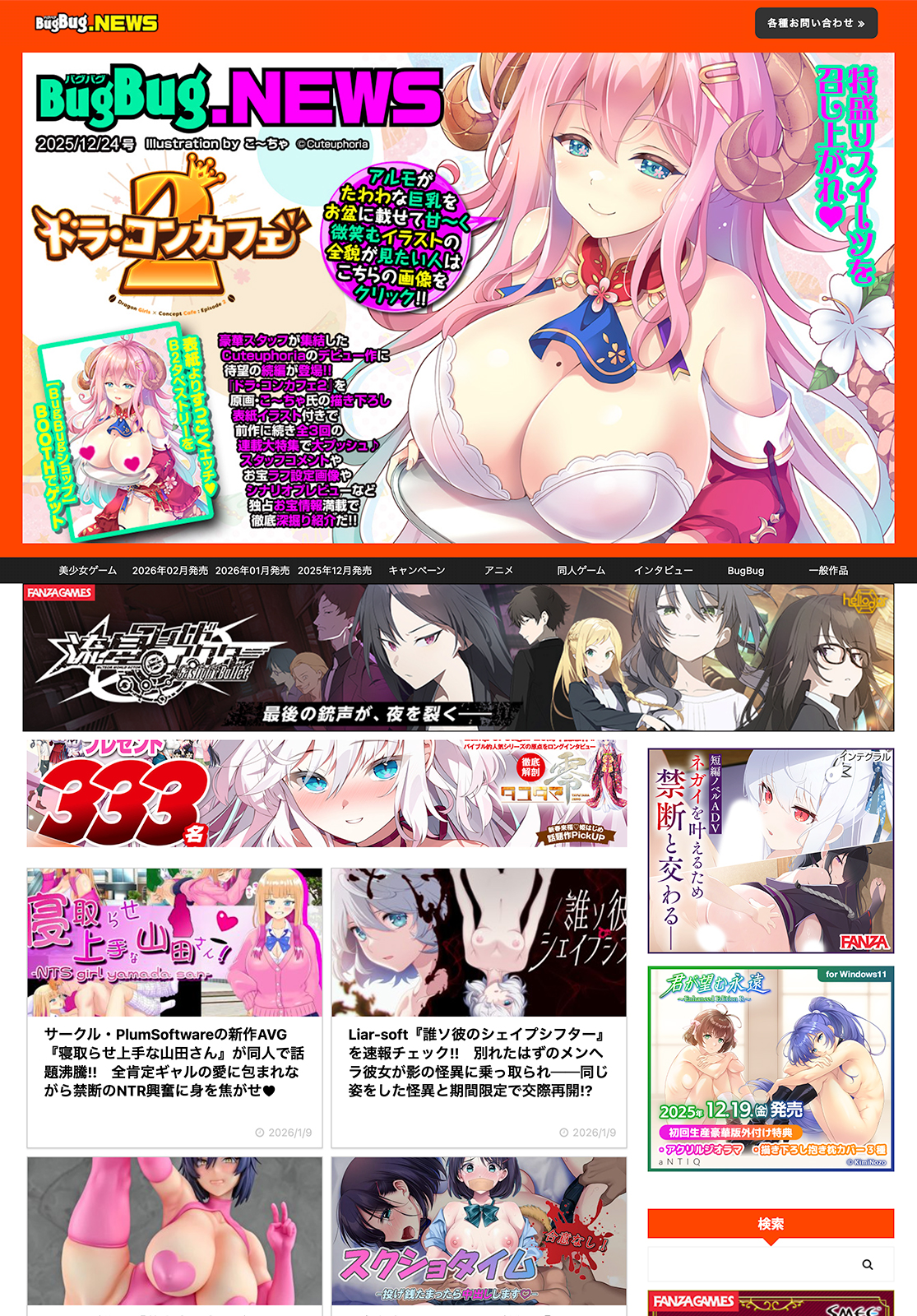 年越しから最新情報が次々と公開される2026年スタートダッシュへ!! いよいよ2026年が開幕。年末年始で忙しい人も、お正月休みでゆっくりできる人も、新年最初の人気記事ランキングのコーナーで旬な話題を ... 忘年会で盛り上がるネタ探しにもBugBug.NEWSの最新萌えエロ情報のチェックがオススメ!? 今年もあとわずか。何かと忙しい時期だけど、忘年会などで久々に友人・知人と会う人も多いのでは? 久しぶりに ... 年末の疲れた体にビキニアーマーや甲冑などのコス性癖がよく効く!? いよいよ年末。仕事の締め切りは早いがクリスマスイベントや冬のコミケそして正月も控えていてワクワクする時期だ。美少女ゲーム情報は年末年始 ... 年末商戦の大作・話題作の合間にピーキーな性癖作品やじっくり腰を据えて遊ぶ作品に注目が集まる いよいよ年末商戦が目の前に迫ってきたこの時期。仕事や勉強で忙しい人も多いだろうが、もうちょっと頑張ればお正月 ... 情報を制するものは年末年始を制す!! BugBug1月号で気になる作品を総チェック いよいよ12月に突入。仕事納めに帰省の準備、様々なイベントで大忙しな師走がやってくる。しかも12月の“月末エロゲの日 ... 年末年始に向けて発売予定カレンダーも要チェック!! 事前にしっかり予定を立ててお正月休みを美少女ゲーム三昧で過ごそう 11月の“月末エロゲの日”をつい先日迎えたこのタイミング。BugBug.NEWSで ...
