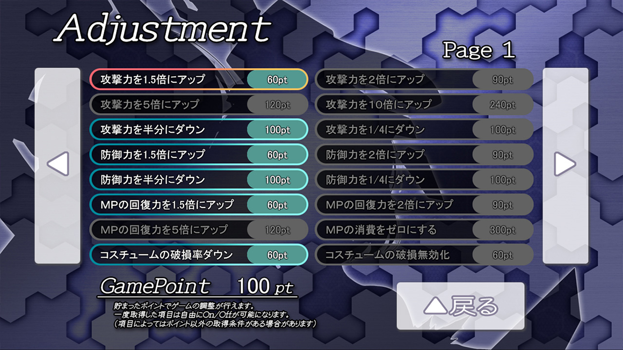 またゲームセッティングも充実しており、難易度やキー設定といった基本的な操作から、ゲーム中に溜まるポイントを使って攻撃力や防御力などを調整することも可能。繰り返し遊ぶことでさらに楽しめちゃう、ヤリ込み要素満載のアクションゲームなのだ★