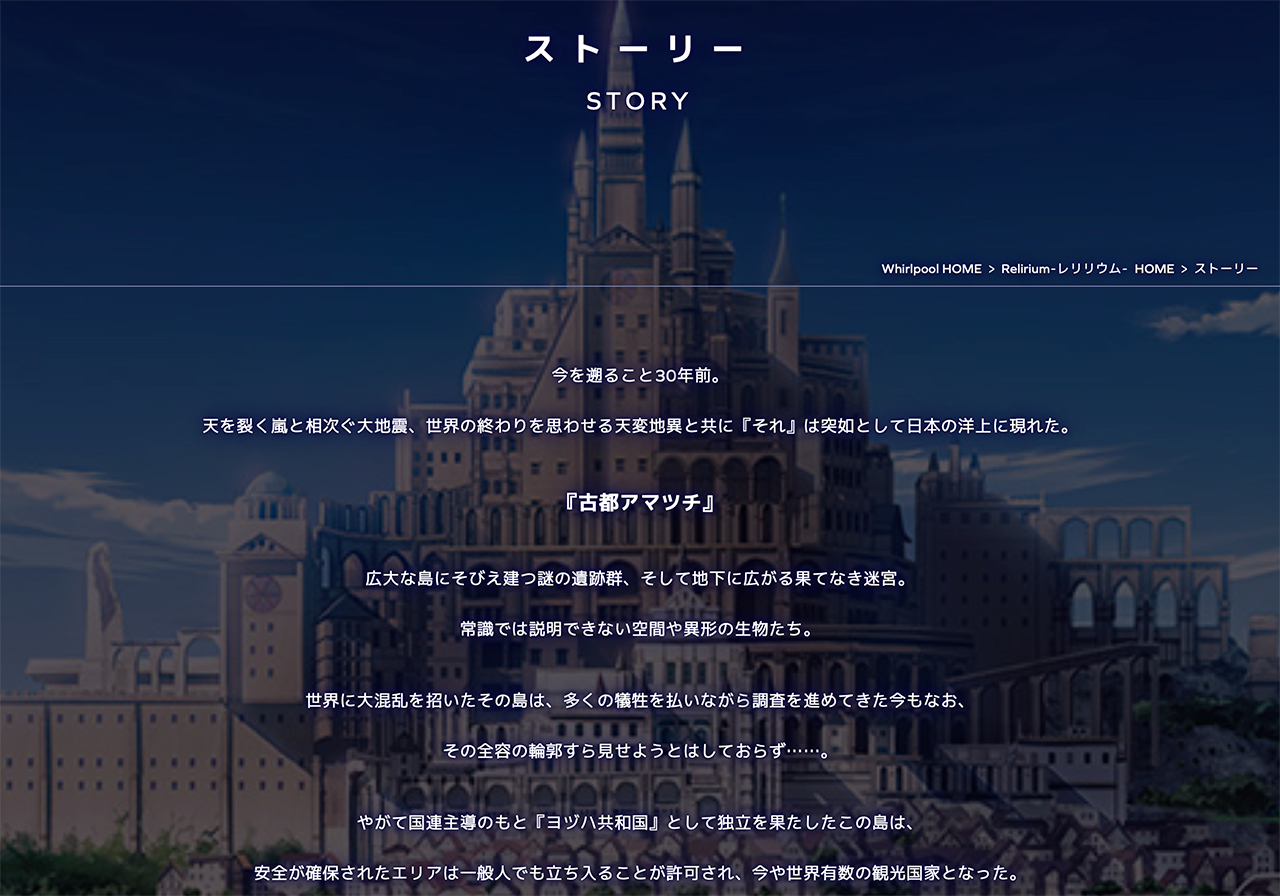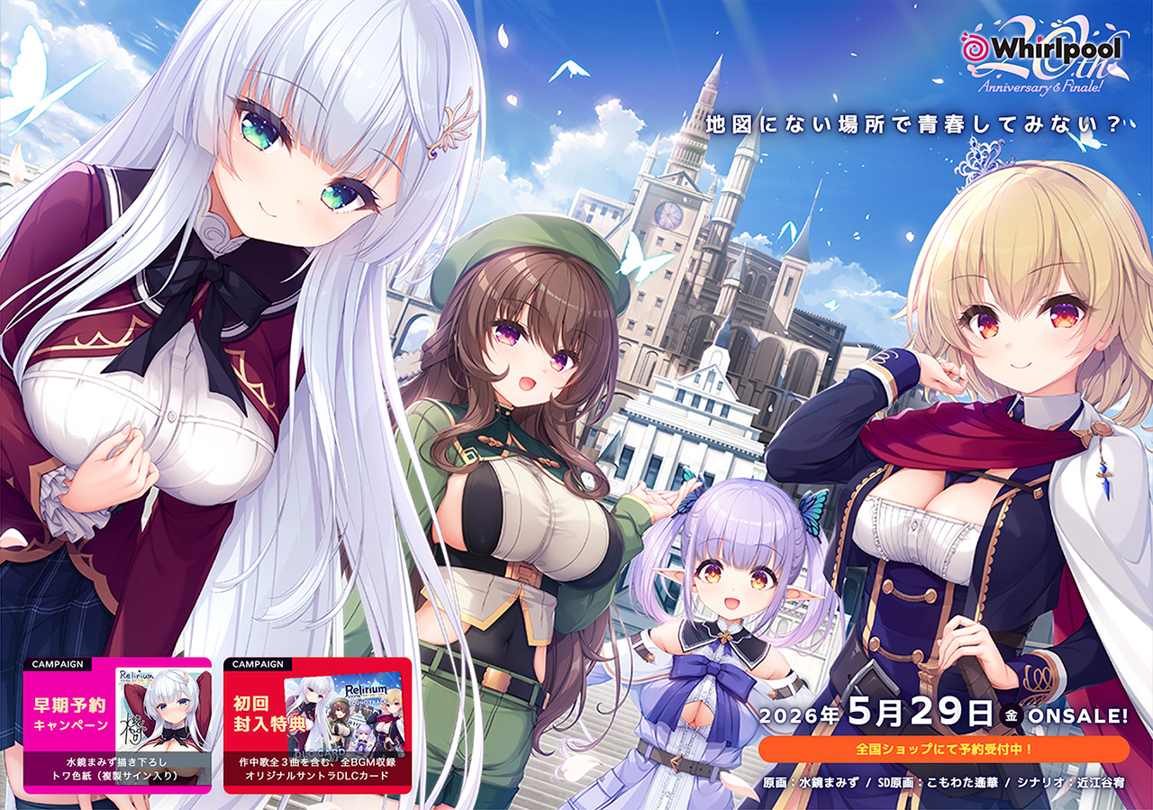 これまで数々のヒット作を世に送り出してきたWhirlpoolが、20周年の節目に解散を発表。その最終作にして最後の挑戦となるのが『Relirium-レリリウム- 遺跡と出逢いと冒険と』だ。本作では日本洋上に現れた古都アマツチ──現、ヨヅハ共和国を舞台に、若者たちの冒険と青春と恋とその他いろいろが描かれる。