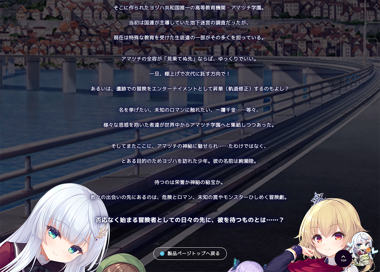 アマツチの地下には果てしない迷宮が広がり、異形の生物や常識では説明できない空間が存在する。そこを調査するのは、特殊な教育を受けた生徒たち。名をあげたい、ロマンに触れたい、一攫千金、さまざまな思惑の若者がアマツチ学園に集うなか、それとはまた違った目的を持って主人公・絢瀬陸はヨヅハに入国する!!