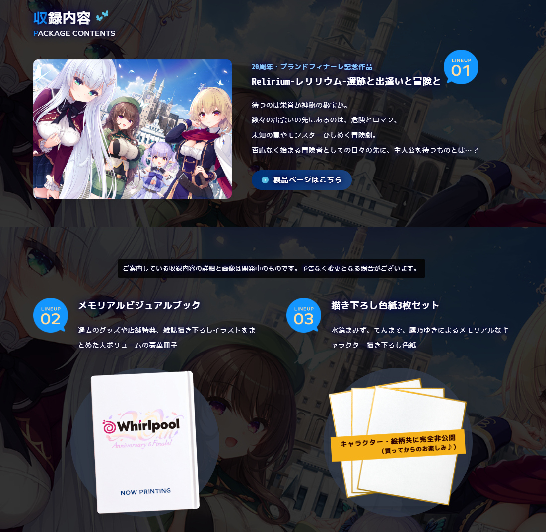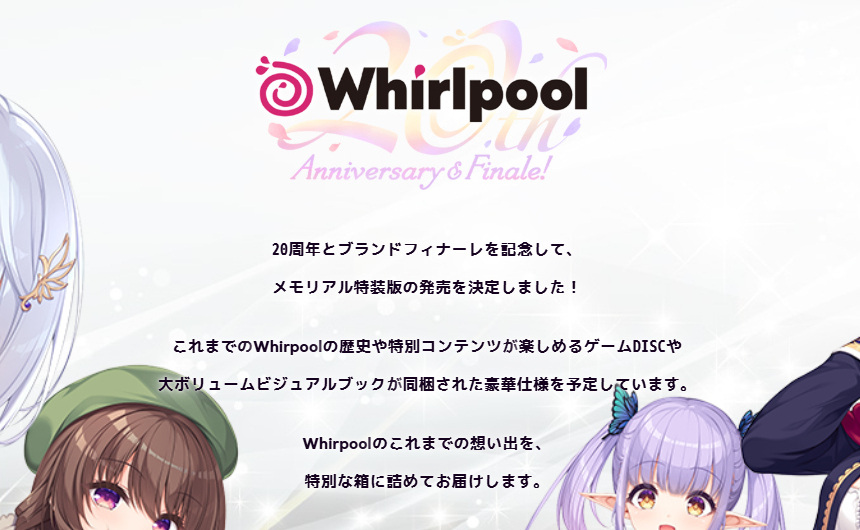 原画は人気絵師の水鏡まみず氏、SD原画はこもわた遙華氏、シナリオは近江谷宥氏で、ブランドの集大成となるパフォーマンスを見せる。Whirlpoolファンにはたまらない、豪華仕様のメモリアル特装版にも注目だ。