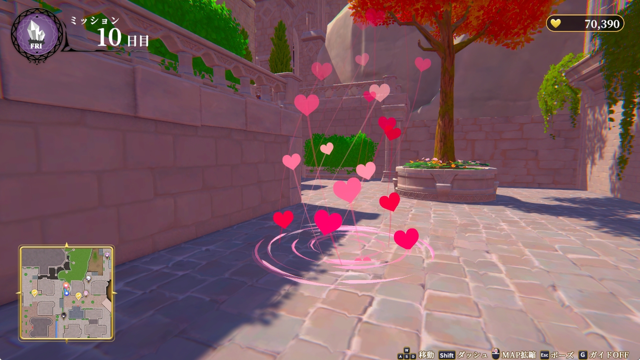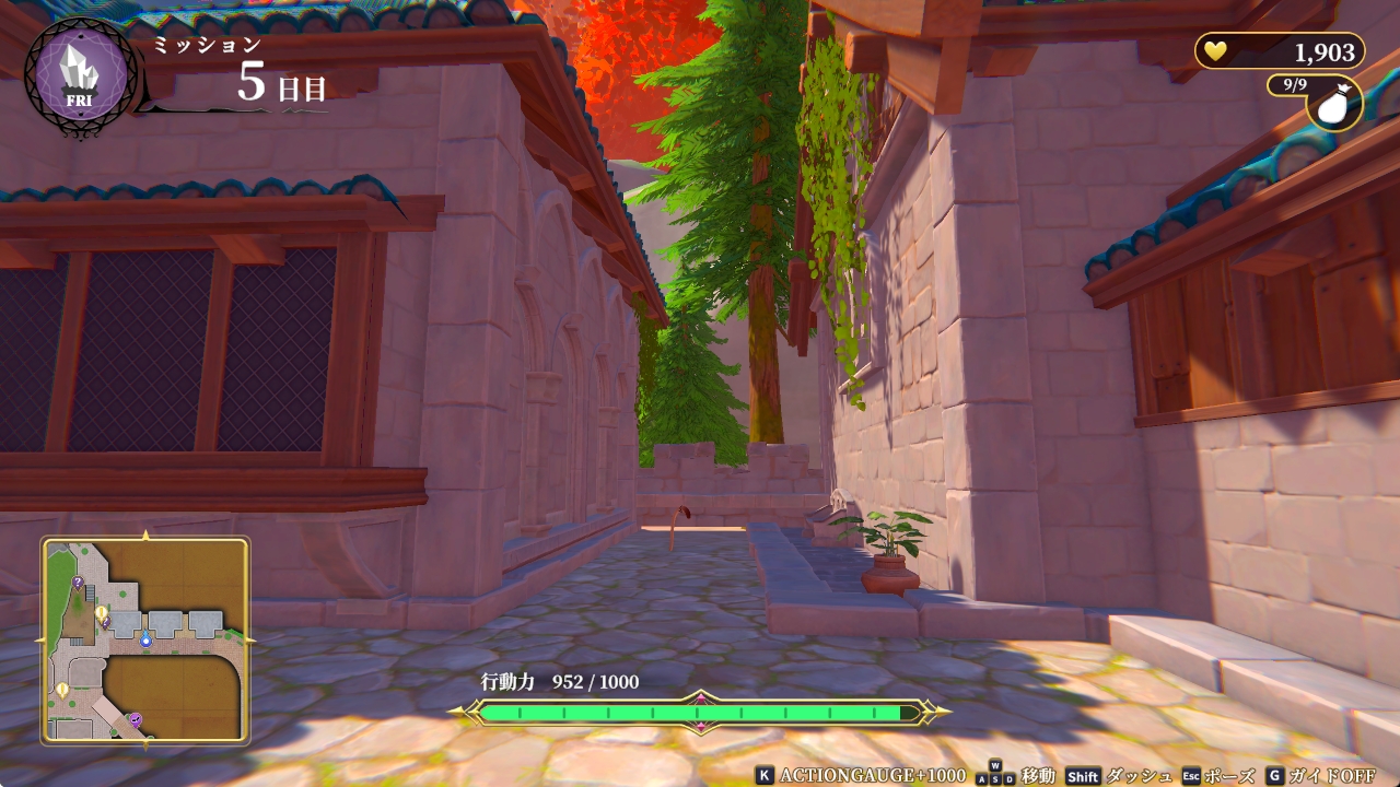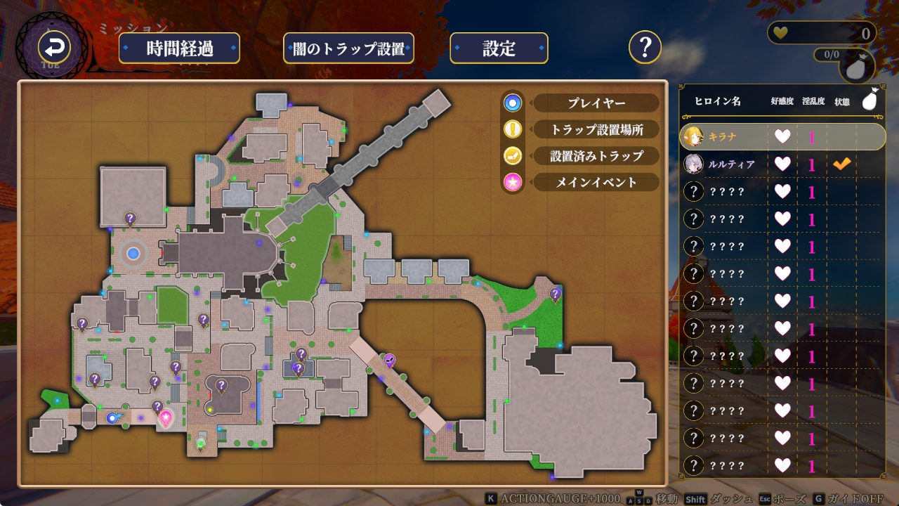 主人公の「行動力」を消費して移動するため、序盤はほとんど動けない。優先したいのはメインシナリオ(キラナ&ルルティア)の会話と、他ヒロイン探索。会話していないキャラはMAPピンや「拠点」の「ステータス」タブに表示されないからだ。