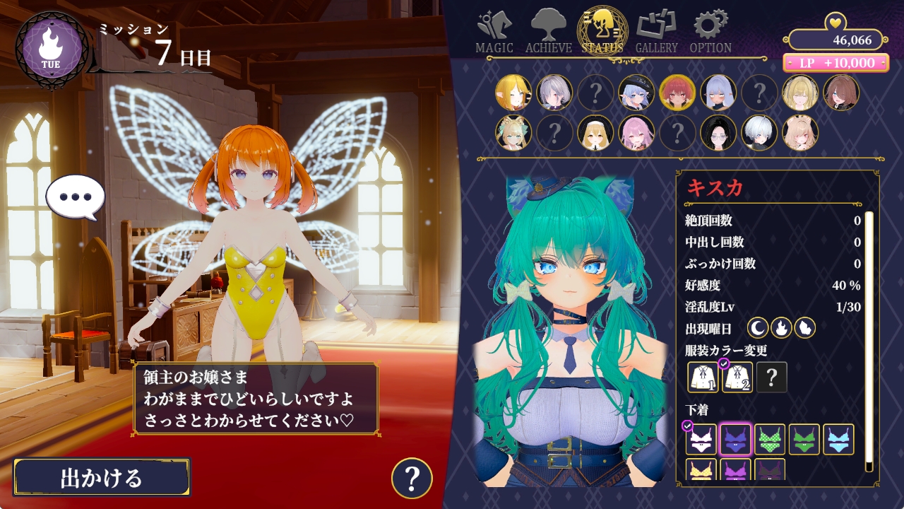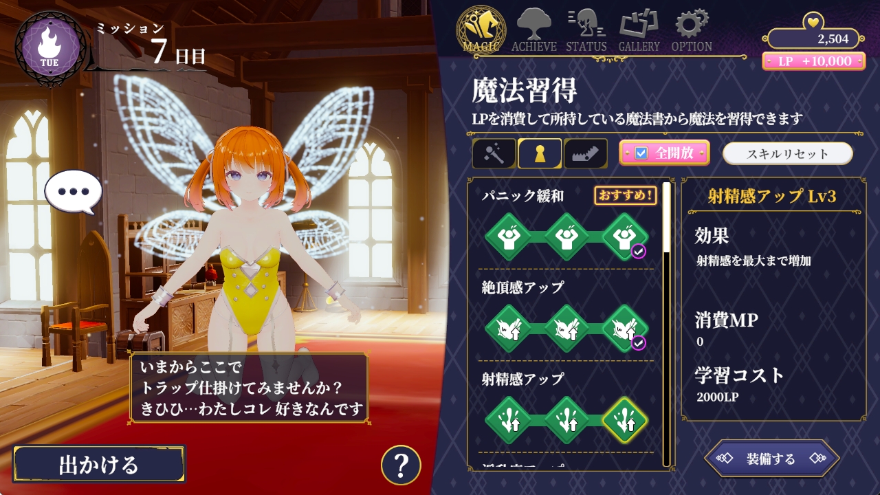 DLCは午前中の探索に必要な「行動力」と、スキル習得に必要な「LP」を追加し放題になる。さらにギャラリーに登録される固有Hシーンの全開放ボタンも追加される。プレイがめちゃくちゃ快適になる追加パッチだ。