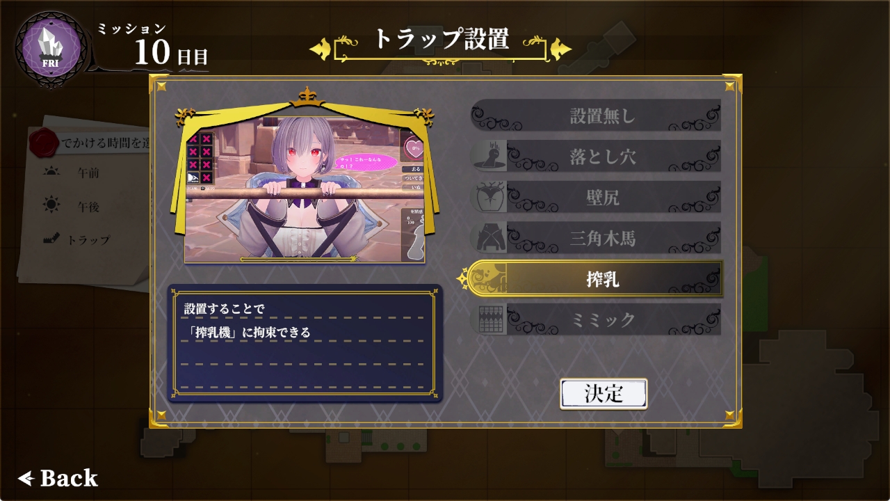 午後にメニューを開き「闇のトラップ」を選ぶと遊べる。時間と行動力は無限だ。誰を捕まえてもLPに違いはないため、手当たり次第に近場のヒロインを狙おう。ジャンプすると通常より早く遠くへ移動できるので、ぴょんぴょん飛んでいるだけで意外と簡単に捕まえられる。