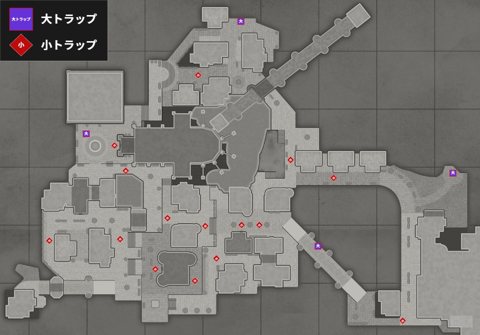 ▲赤が魔法の罠を設置できる解放ポイント。大はギャルゲッチュ用の大型罠がある。MAP右下は壁尻となっており初期から所持しているので、他の3つを回収しよう