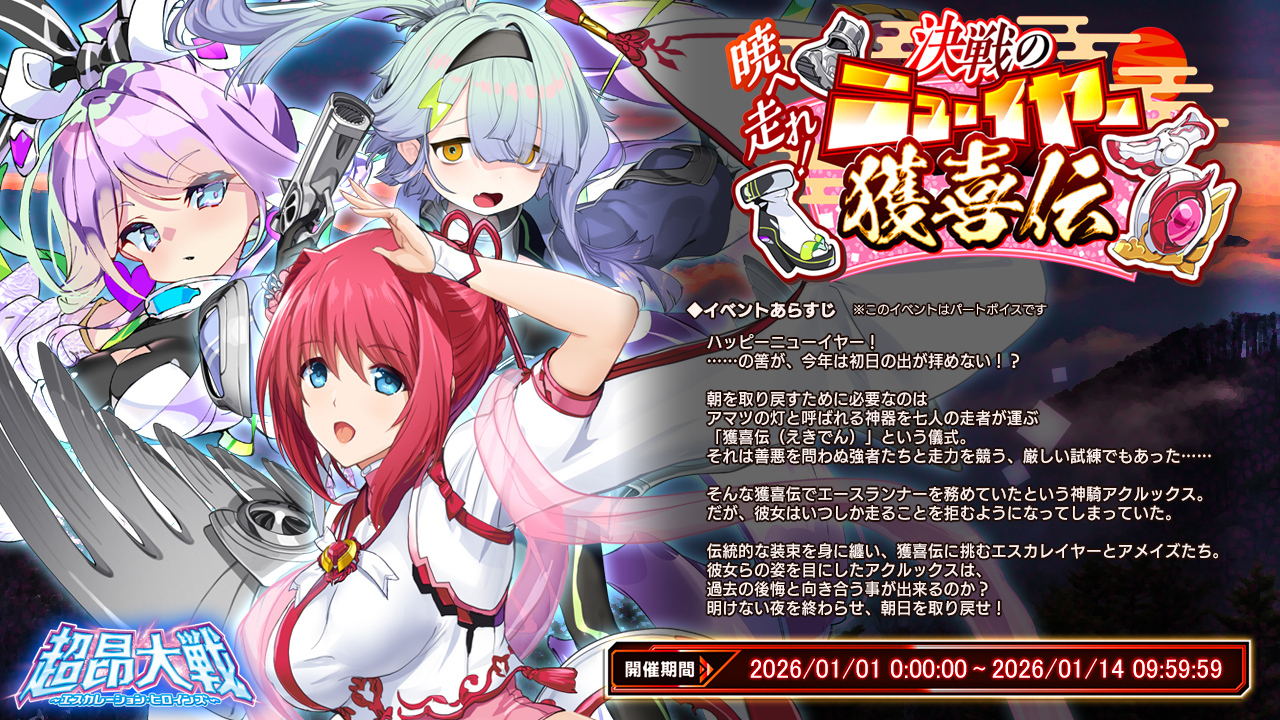 【プレゼントコード付き】『超昂大戦』は正月イベント2026『暁へ走れ! 決戦のニューイヤー獲喜伝えきでん』開催中!! みんなの願いをタスキで繋ぎ初日の出を取り戻せ!!