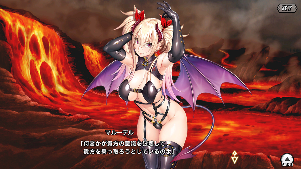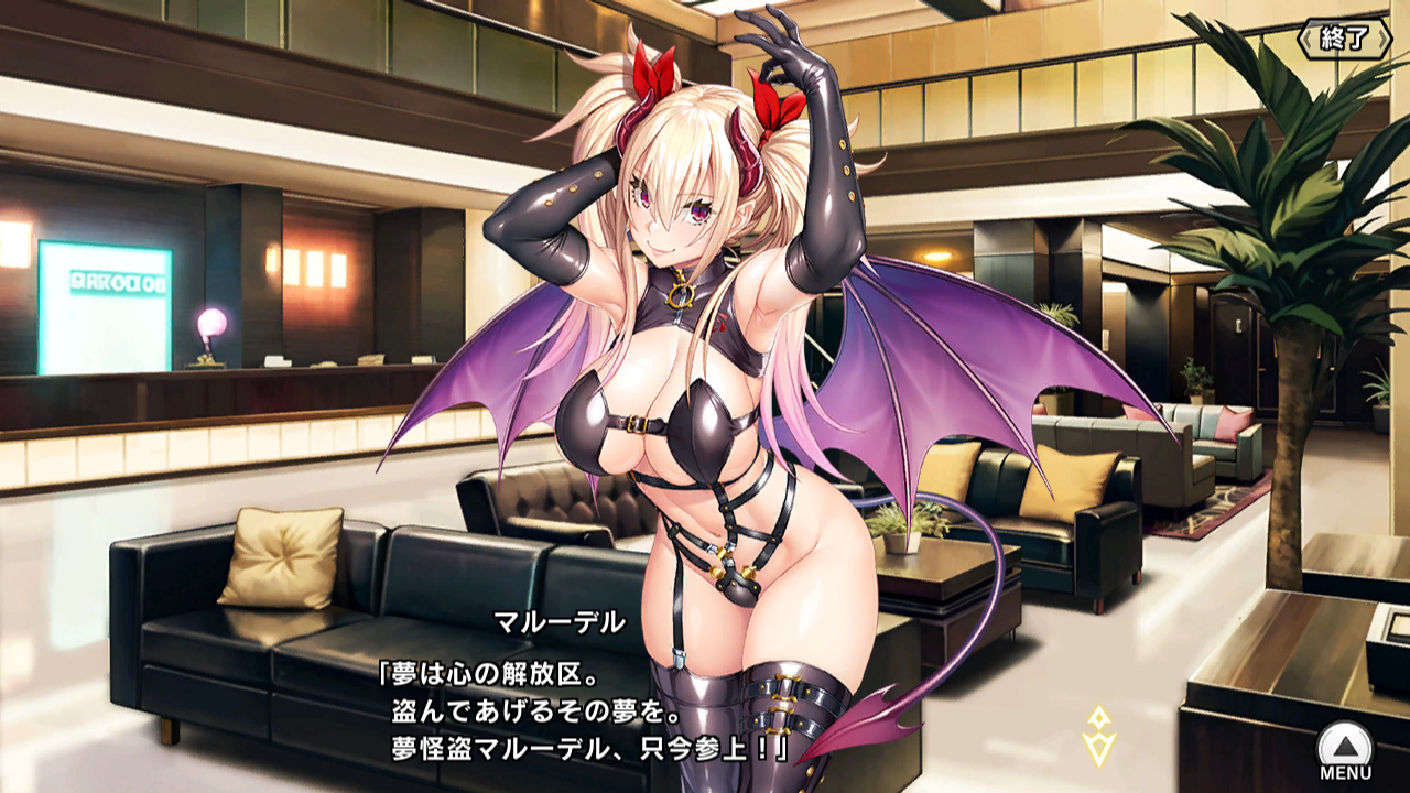 今回はガチャがさっぱりだったので、報酬で手に入れたSR【今宵夢の中で】マルーデルをご紹介。HRの時が怪盗っぽいデザインだったのが、今回はサキュバスっぽさが前面に出ている。
