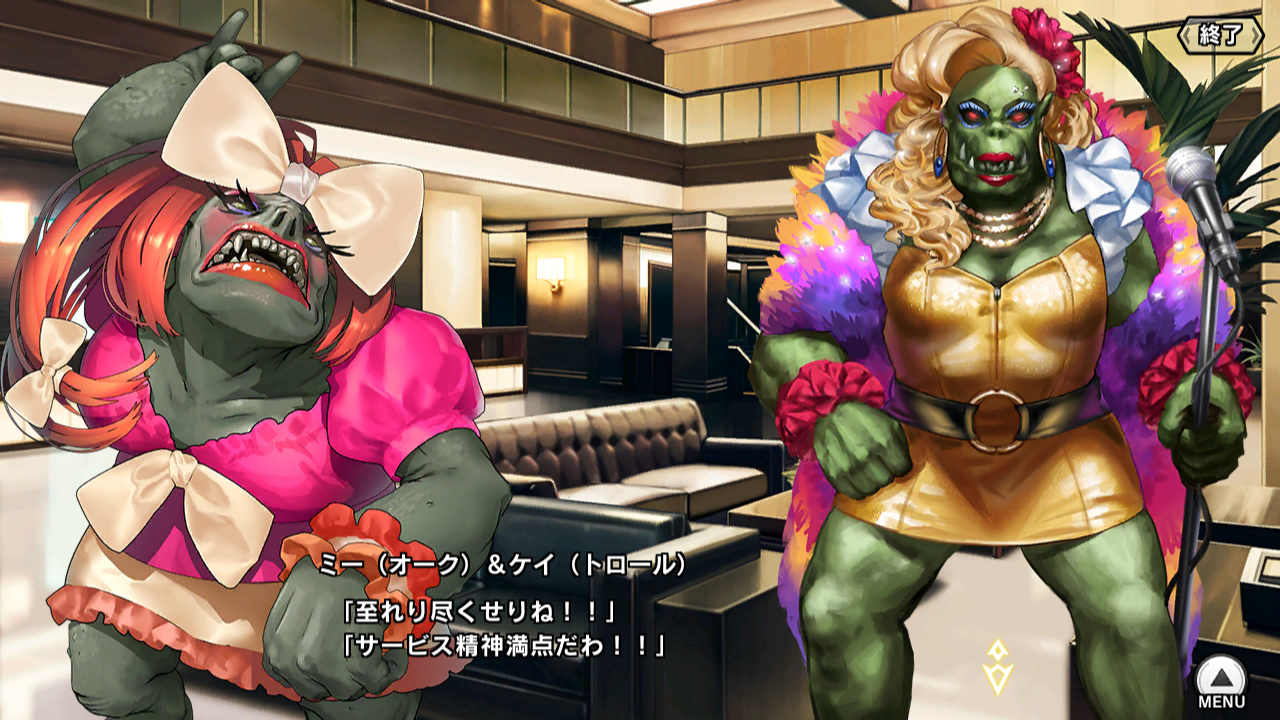 ▲アミダハラ観光協会と言えば、ミーとケイのオーク&トロールコンビ。アミダハラが舞台になることが増えて、もうすっかりお馴染みになった。よく見るFBQ(ファンキー・ビースト・クイーンズ)の3人組から熊を抜いたのじゃなくて、別の個体っぽい。多分。……深く考えるのはやめておこう