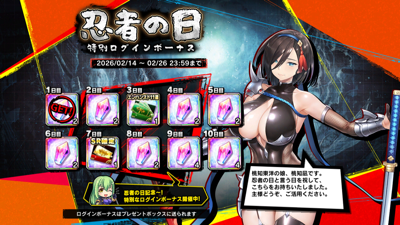 ▲忍者の日特別ログインボーナス、リリース2700日記念ログインボーナスも開催中。特に忍者の日(2月22日)のボーナスはSR確定ガチャチケットが手に入る豪華なもの。キャラクターは『RPGX』への登場が予告されている『アクション対魔忍』の桃知凪。これからは18禁サイトだから遠慮してた『アクション』の話もしていいってこと!? ヤッター! 凪はアサギの師匠、桃知東洋の娘で『アクション』版出雲鶴ポジション(ふうま宗家の護衛兼下働き)のキャラだ。詳しくは登場した時に語ろう! 『アクション』は姉ゲーでふうまお姉ちゃんズがたくさんいて楽しいぞ!