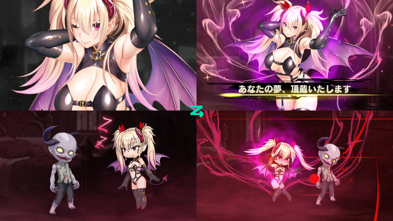 ▲奥義・あなたの夢、頂戴いたしますの演出。寝ている敵に正面から近づいたマルーデルが一瞬で背後に回り込み、ドクドクと何かを吸い取っていく。最近、立ち絵の演出に力が入っており、マルーデルにも閉じた目を開くアニメーションがある