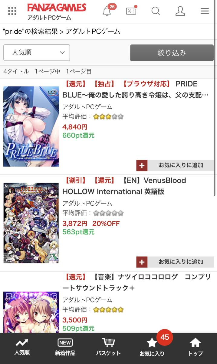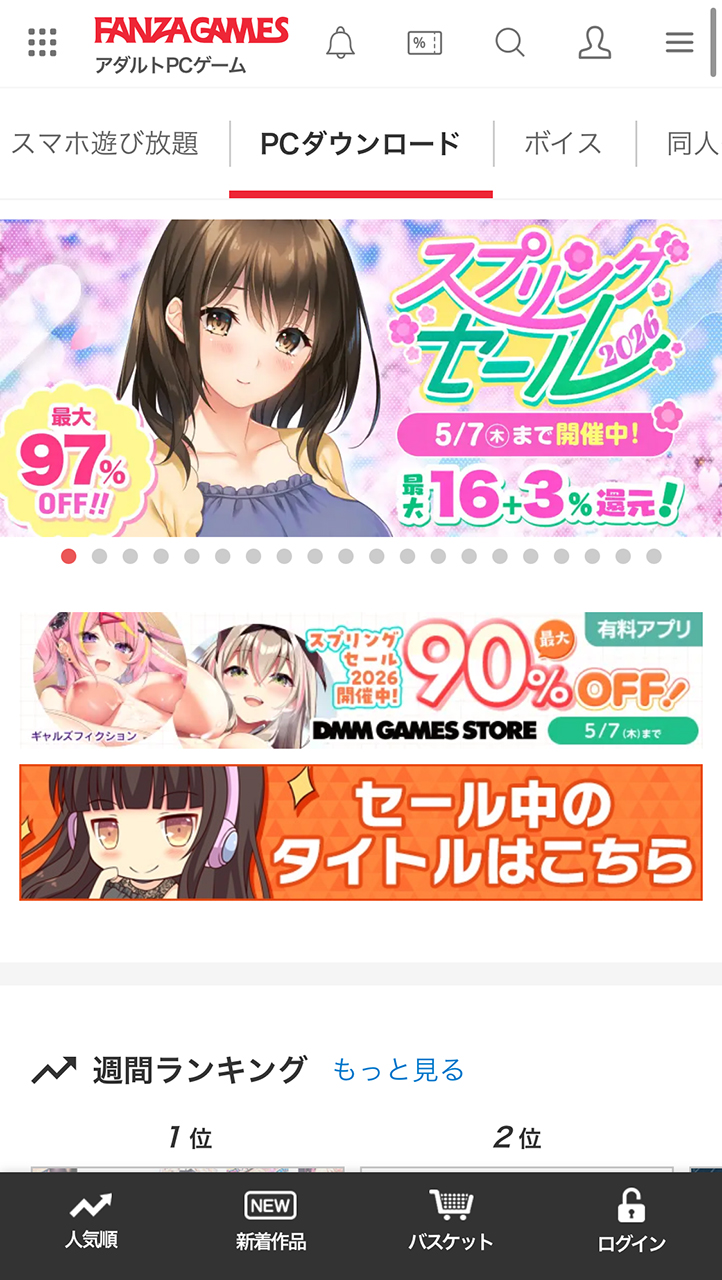 ▲ブラウザでFANZAの「PCゲーム」トップ画面を開こう。そして、右上の虫眼鏡アイコンから作品を検索だ