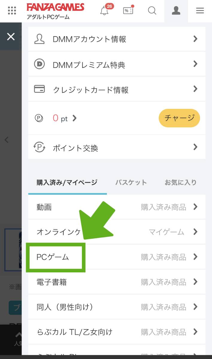 ▲購入後は虫眼鏡アイコンの右にある人型アイコンより「購入済み/マイページ」の「PCゲーム」をクリック