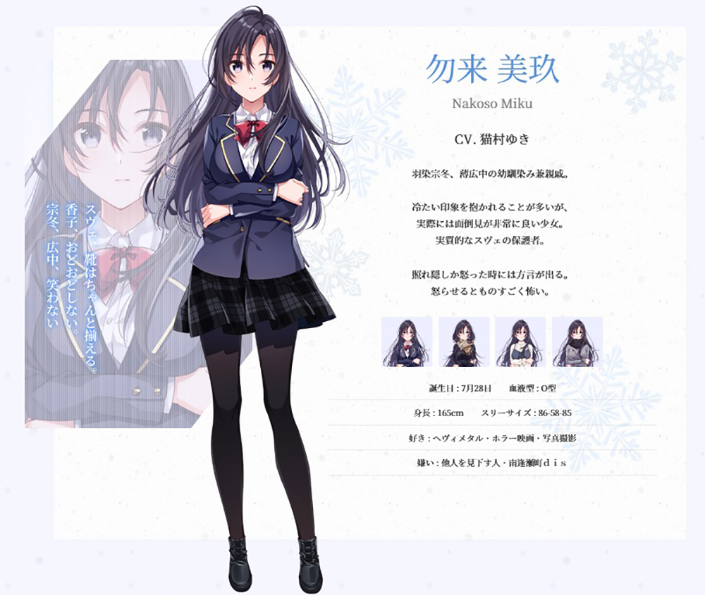 現在までに紹介されている登場人物は、主人公を含めて8人。メインビジュアルから、ヒロインは美玖、スヴェトラーナ、香子の3人のようだ。彼女たちとの交流のなかで、絆が生まれたり、時には反目が生まれたりするのかと思うと、想像がとても掻き立てられる。また、脇役たちも本作では重要な役割を果たしそうなので、そこも気になるところだ!!