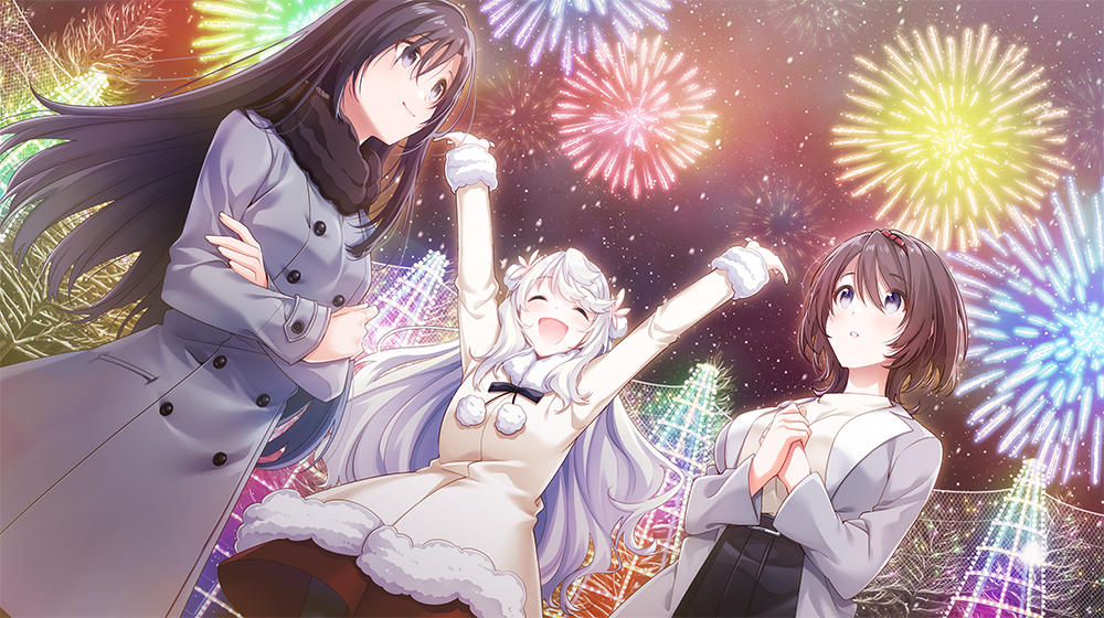 ▲3人が見上げるのは色とりどりの花火。本作は純白のイメージが強いので、カラフルなこのシーンはとても印象的