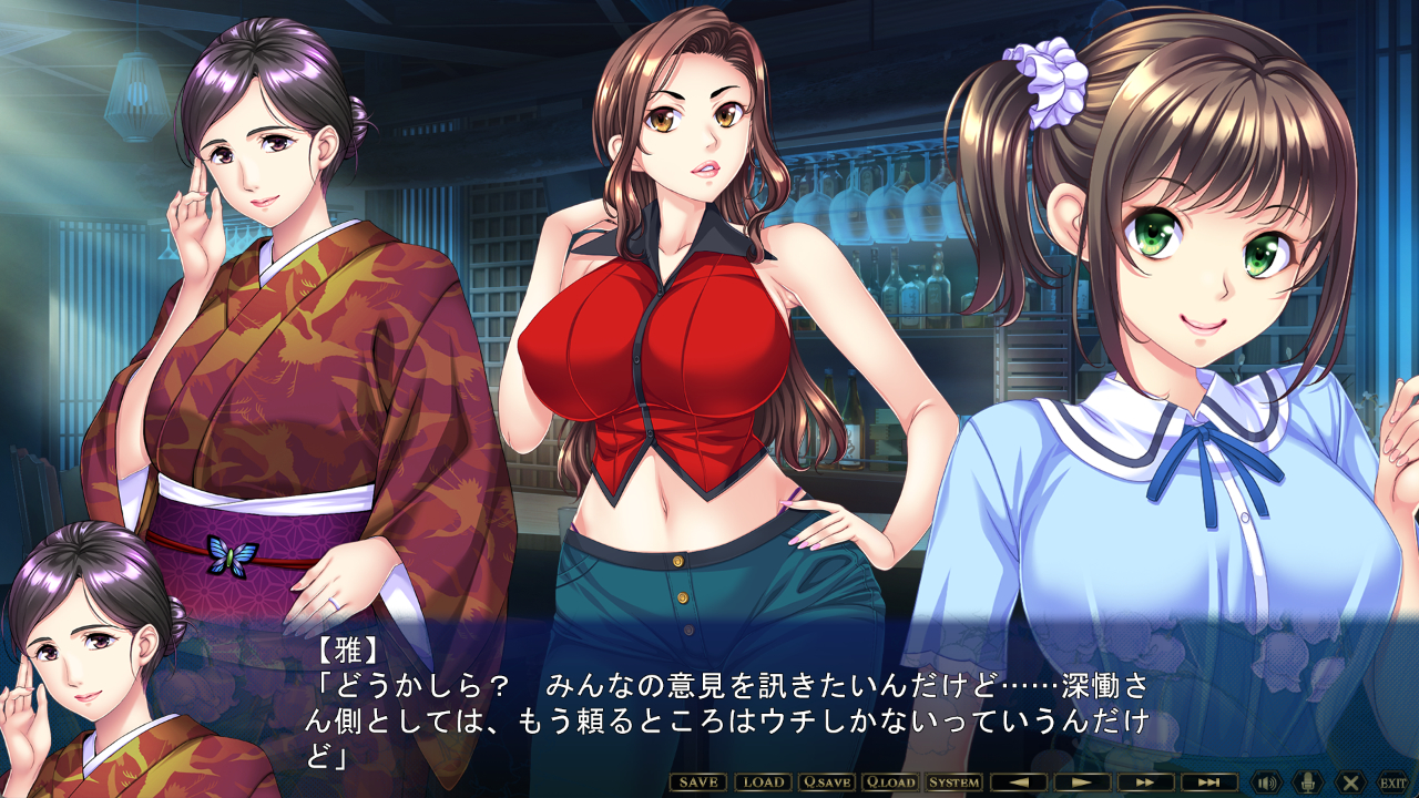 ▲「BAR雅」に集まるヒロイン達。前作から引き続き登場しているキャラたちだが、今作だけでも問題なく楽しめるのでご安心を