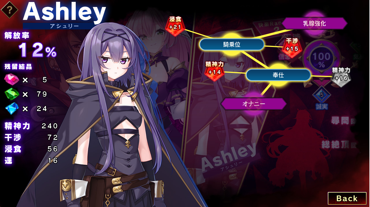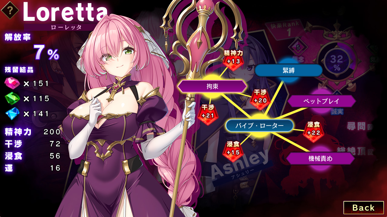 他にも各ルーンの力を持つローレッタとアシュリーのふたりとHすることで、彼女たちの力を譲渡されて新たな調教メニューが解放される。