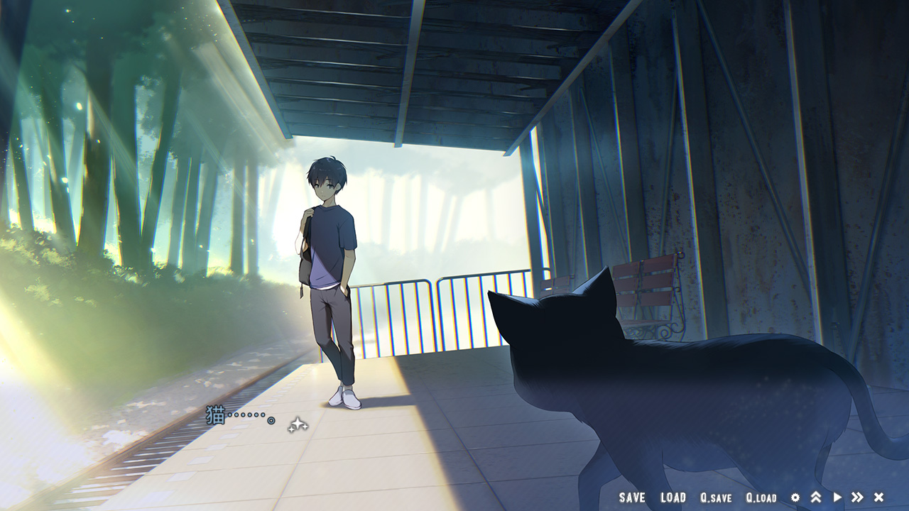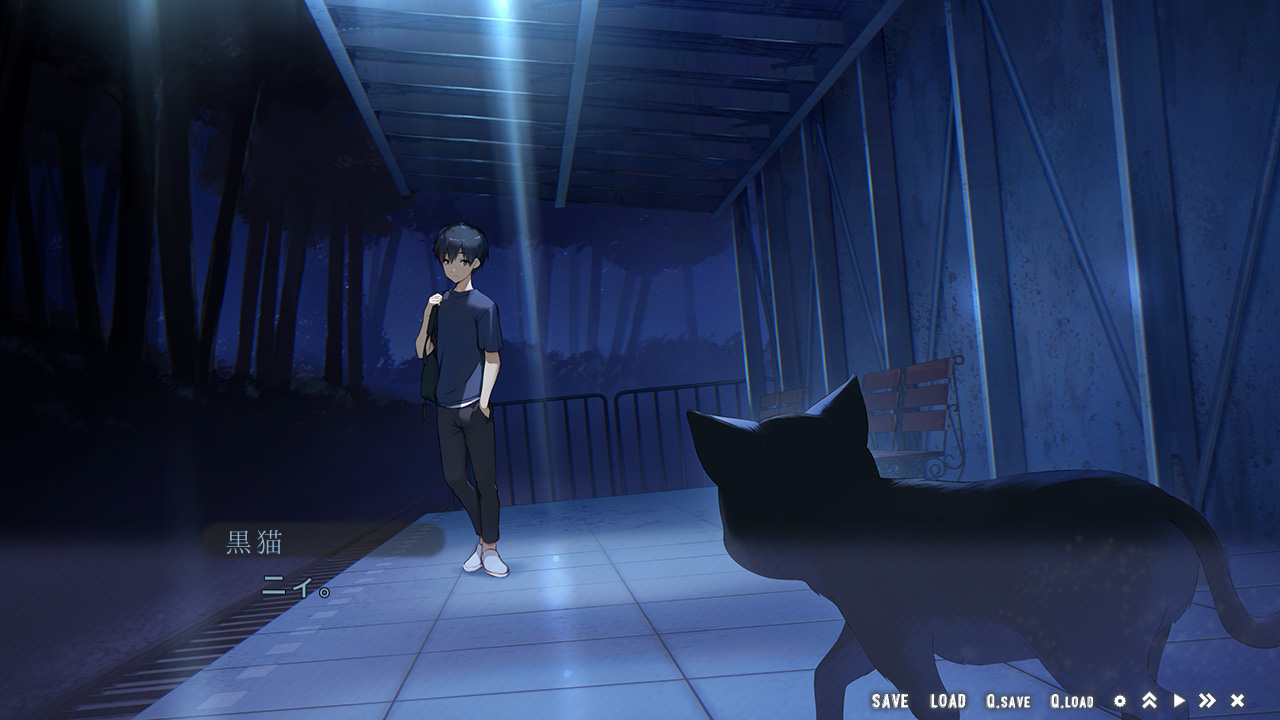 ▲夜汽車ツアーに参加するため駅で待っている主人公。他に人影はないけど黒猫が…旅立ちの前に不吉かも