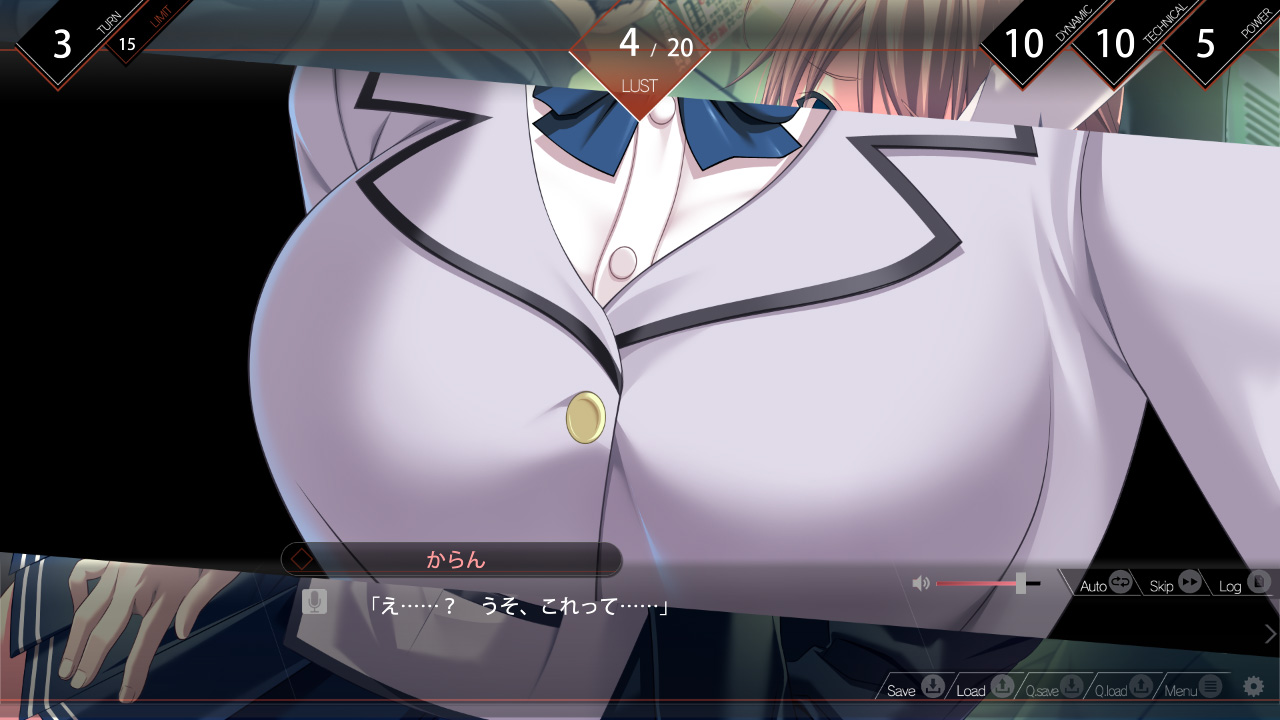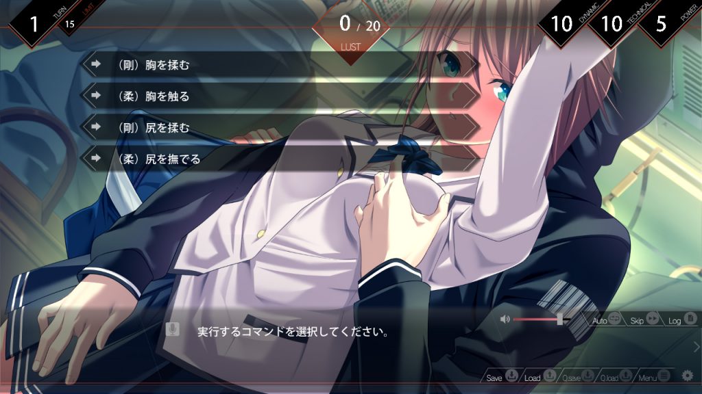 さて痴漢パートですが、基本的には前作と同じく、制限ターン内に相手の快楽値を上げてイカせるのが目的となります。どこをどう触るかを選択肢で選ぶのですが、ヒロインによって弱点があるので、反応を見ながら選ぶ必要がありますよ。触った部位によって異なる局部のカットインが入ったり、快楽値が上がると服がはだけたり臨場感があって興奮します!! また特定条件を満たすと必殺技を使えるので、色々と試してみる面白さもありますよ♪
