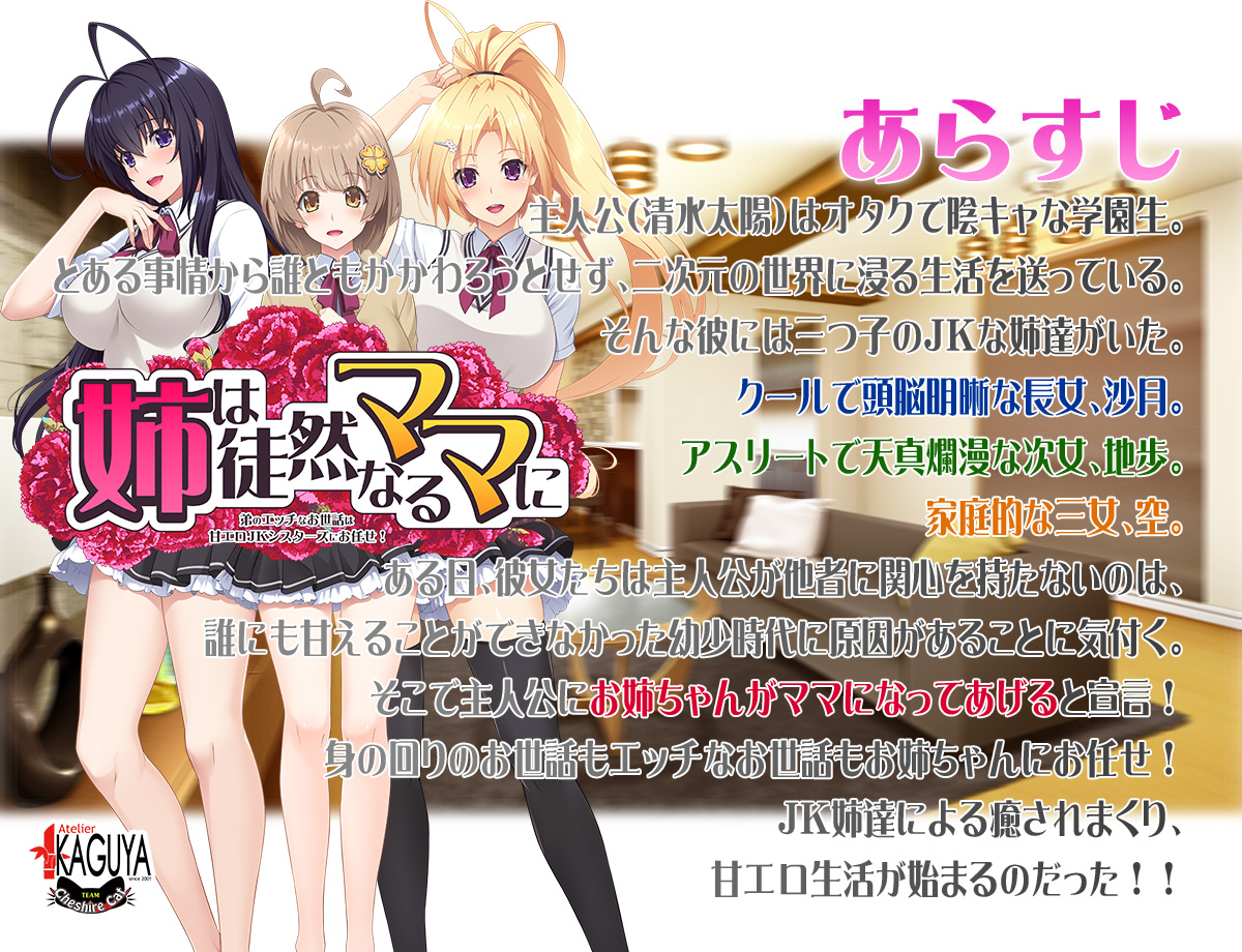 アトリエかぐや Cheshire Catが放つ最新作が遂に発表。BugBug.NEWS初紹介となる今回は、公式HPを中心に紹介しつつ、HPではまだ公開していないイベントCGも先行公開しちゃうぞ。本作は個性的で巨乳なJKの姉たちに、身の回りからHなことまで何でもお世話されちゃう主人公のお話。身近な異性である姉が、ママになってHなことをしてくれるという、姉&ママ好きにはたまらない作品となっているのだ。制作を担当するのはおなじみのコンビである、H+O&七歌の両氏。また本作もHシーンにはアニメーションを導入しており実用性も十分。クールな長女、運動神経抜群な次女、家庭的な三女の3人の姉に、いっぱい抜いてもらおう♪