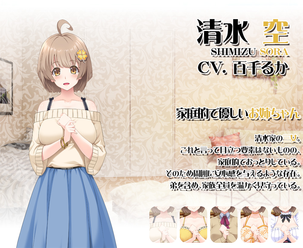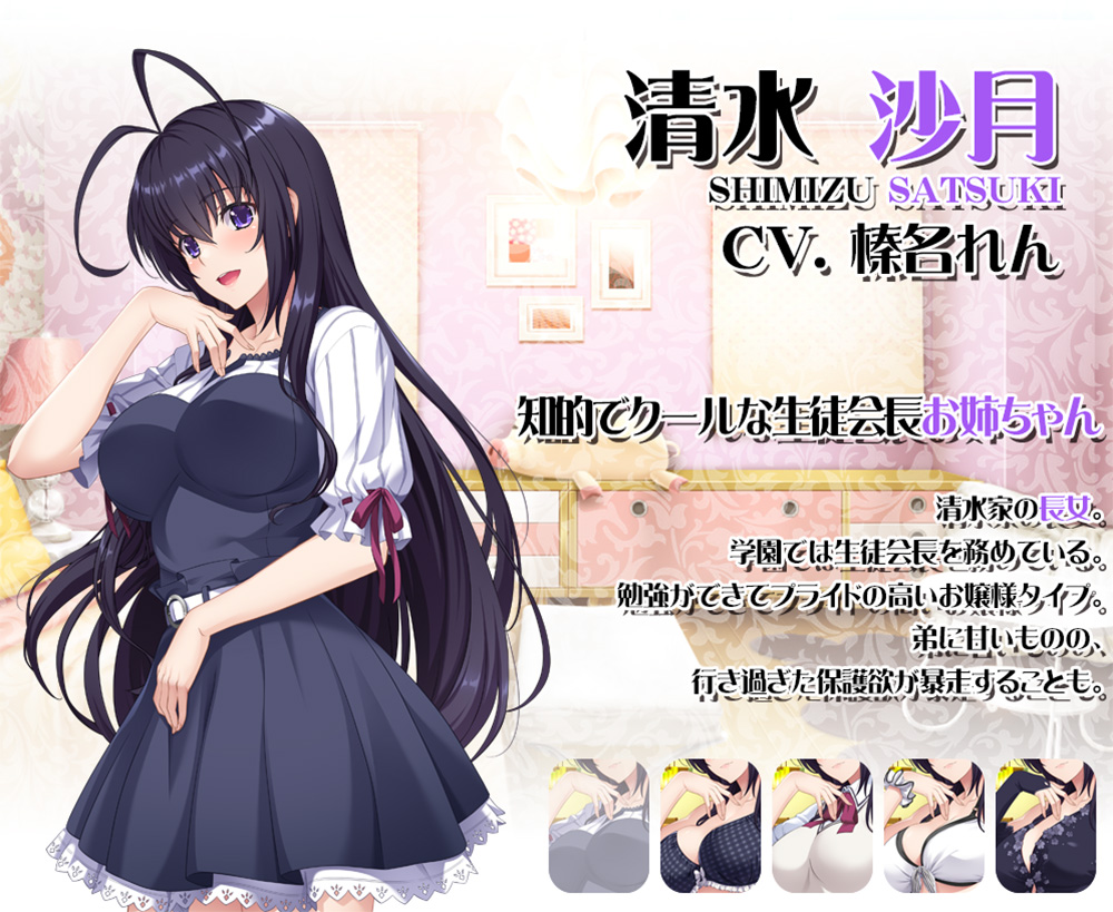 本作のヒロインとなる3人の姉たちを紹介。黒髪ロングで学園では生徒会長を務めるクールなお姉ちゃんである沙月。綺麗な金髪と陸上部で活躍する明るい地歩。家庭的で安心感たっぷりの空。彼女たちが弟のために、コスプレしたりハメ撮りしたり、赤ちゃんプレイや露出プレイなど、様々な要望に応えてくれるのだ。想像しただけで今からプレイするのが楽しみだぞ♪