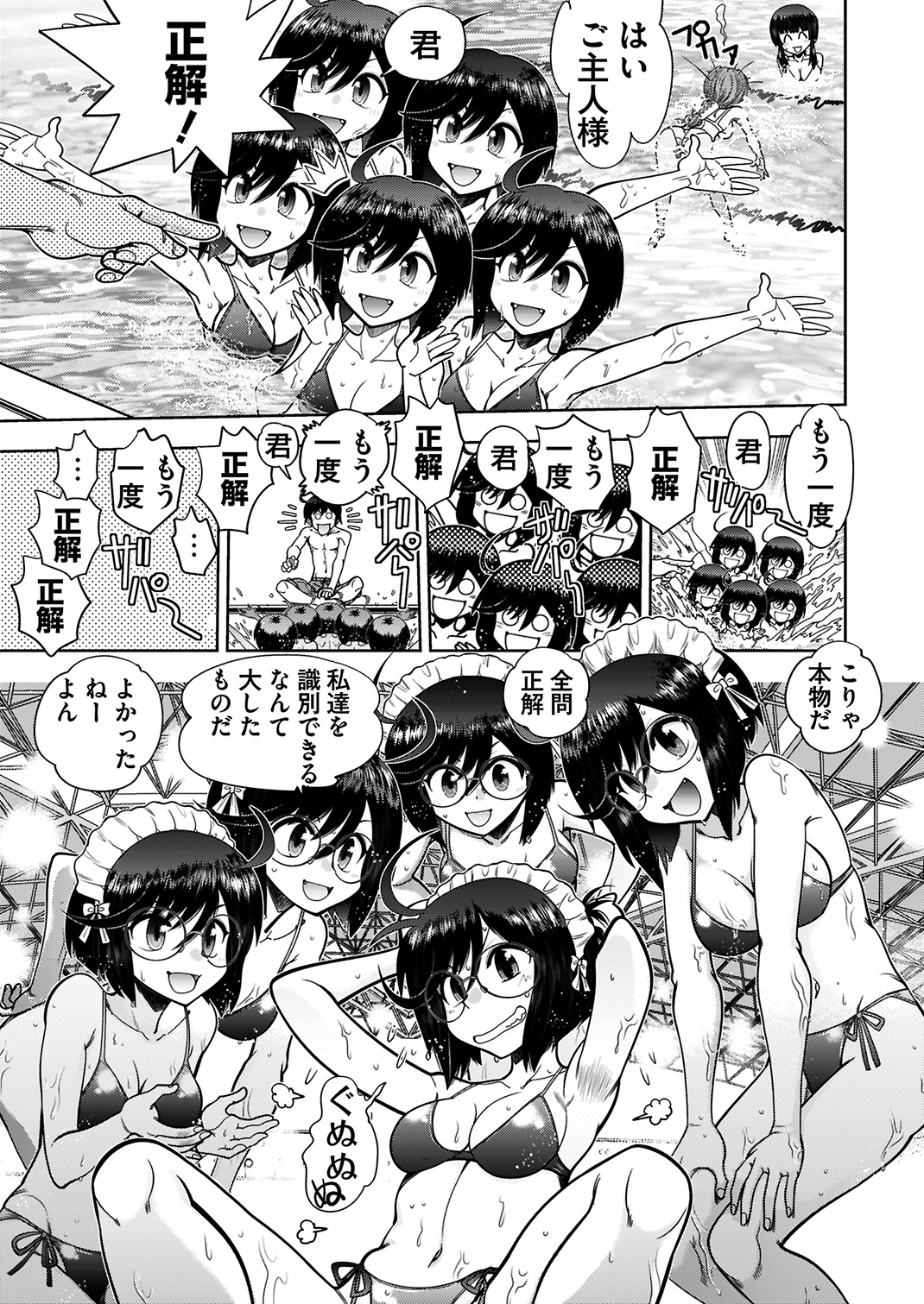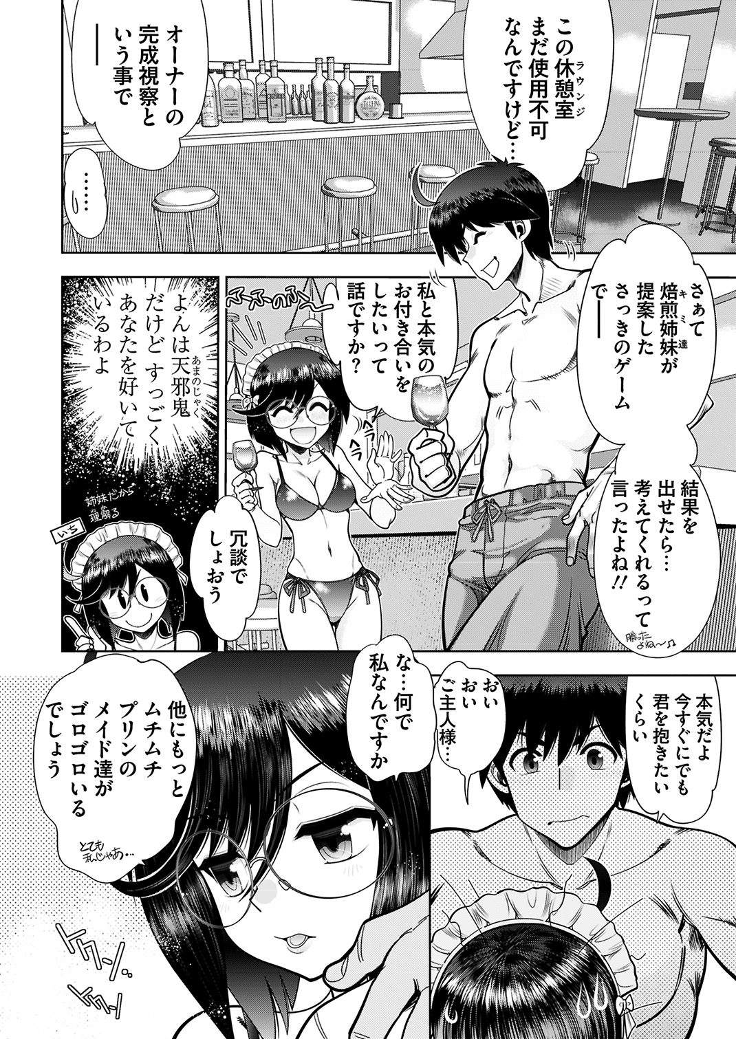 四姉妹のアドバイスのお陰もあって、見事よんと結ばれた主人公。絶頂した彼女が気を失うと、背後から四姉妹たちが現れ「おめでとうご主人様、見事に攻略しましたね♪」と祝福。まさかのHなご褒美をおねだりしてきた!? これには主人公も「全員オーナーとして攻略してやるっ!!!」と発奮。まさかの姉妹丼ハーレムHと、その後のよんの可愛い反応は、是非本誌を購入して確認しよう!!