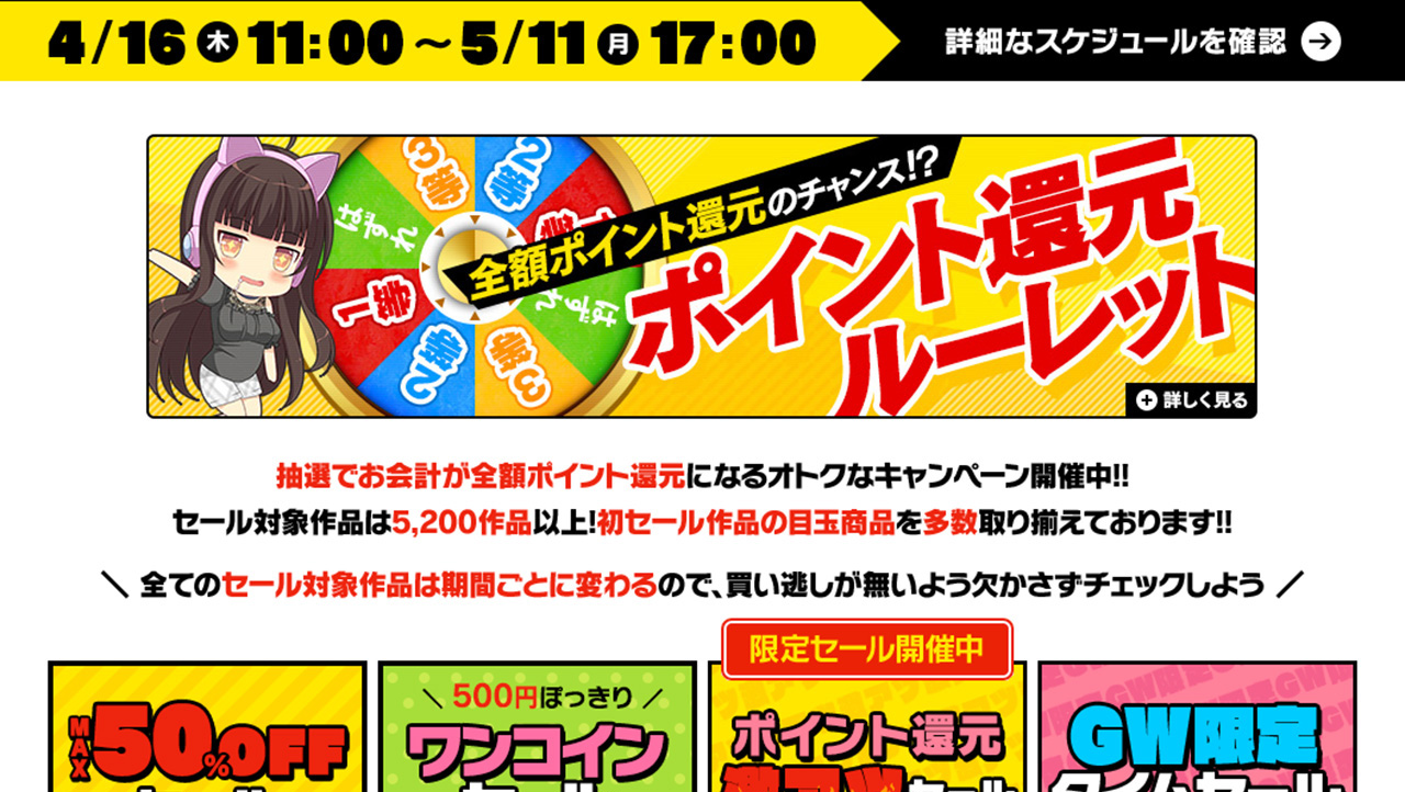 もちろんキャンペーンの最後までポイント還元ルーレットは開催されているぞ。GWキャンペーン中にFANZA GAMESで美少女ゲームを2000円以上購入すると、毎回チャレンジできるこのルーレット。何と1等は全額ポイント還元で、実質無料!! 3等でも10%還元と超お得だぞ。最後に大当たりを狙っちゃおう♪