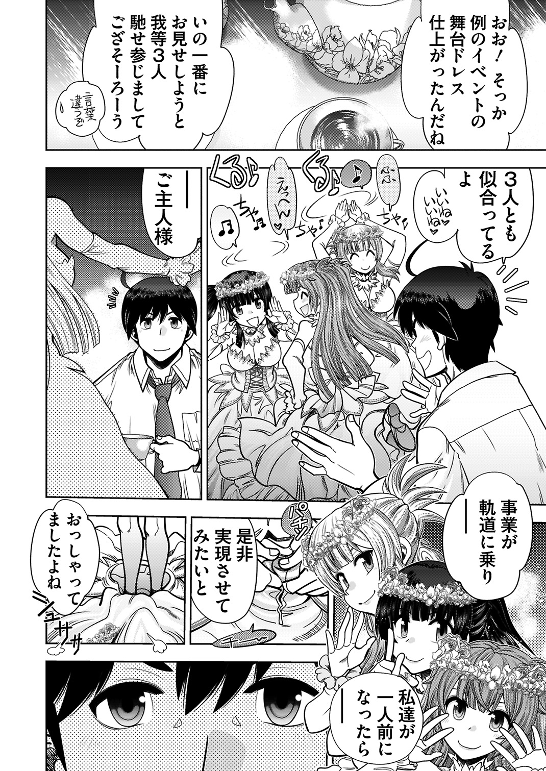 代わる代わるご主人様とHして、気持ち良くなった3人のメイドたち。実はそんな光景をドアの隙間から、メイド秘書のエマとよんが覗いていた!? 「当てられて変になりそう」と忍び足で去ろうとするが、3人にバレてしまう。3人に捕獲され身体を弄られ、感じてしまっていたのがバレてしまうエマとよん。ご主人様も「よしよし途中参加歓迎だ!」とノリノリで、2人もハーレムHに参加する事になってしまい…!? ド迫力のハーレムHの全貌は、是非本誌を購入して確認しよう!!